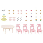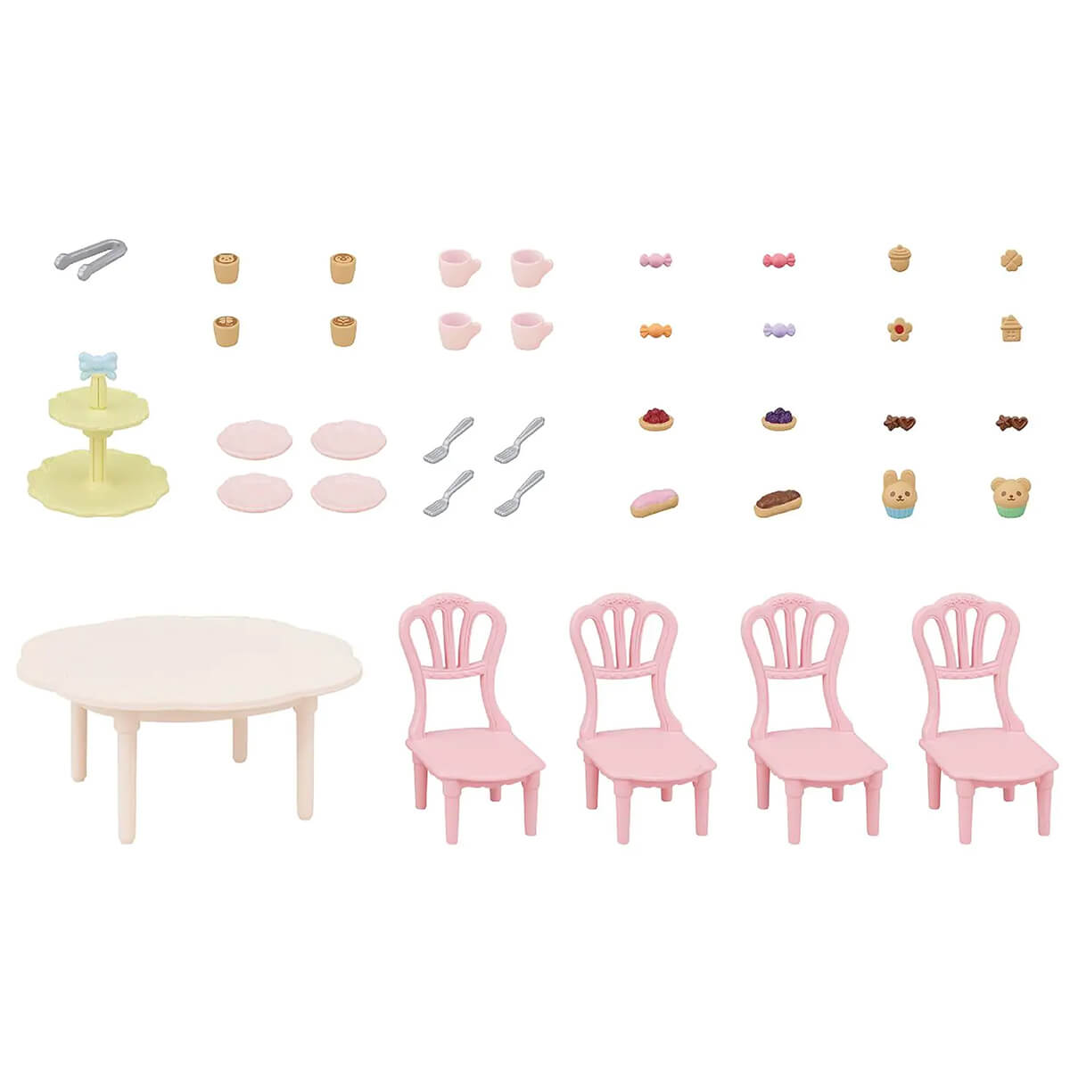 The set includes: Table, Chairs x4, 2-tier Cake Stand, Ribbon, Plates x4, Forks x4, Tongs, Caffe Latte (Cat), Caffe Latte (Penguin), Caffe Latte (Clover), Caffe Latte (Tulip), Cups x4, Cupcake (Rabbit), Cupcake (Bear), Eclair (Chocolate), Eclair (Strawberry), Tart (Strawberry), Tart (Blueberry), Cookie (Acorn), Cookie (Clover), Cookie (House), Cookie (Flower), Chocolates x2, Candy (Strawberry), Candy (Peach), Candy (Orange), Candy (Grape).