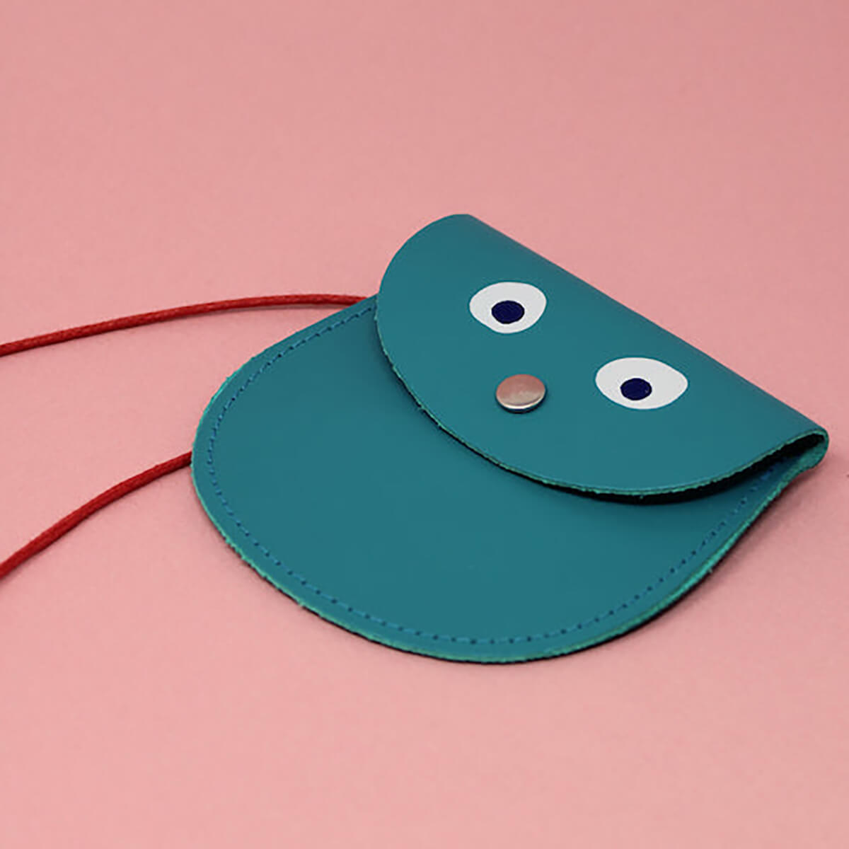 Googly Eye Pocket Purse by Ark Colour Designs. A leather purse with fun googly eyes on a red cord perfectly sized to hold a bank card, or any other small treasures. Features a brass press stud closure and a quick-release clasp on the cord for safety.