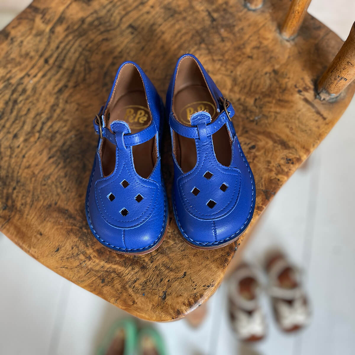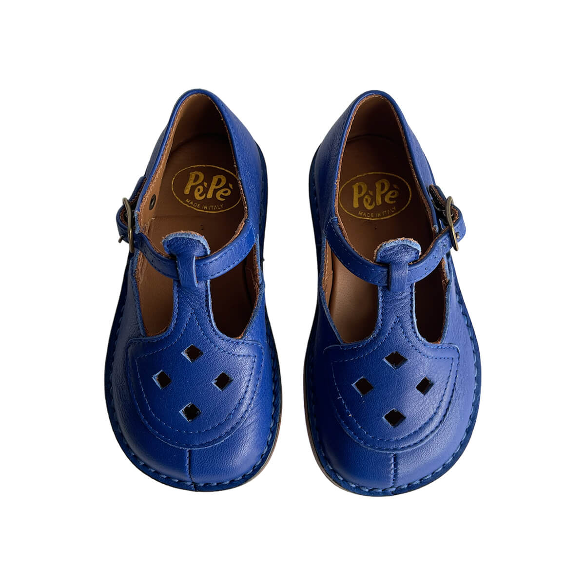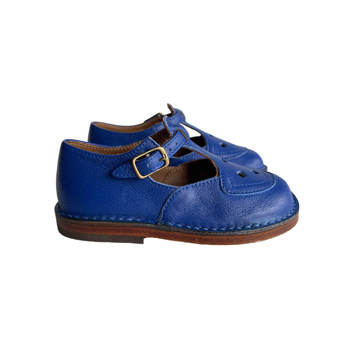 Ezra cut out sandals by PèPè shoes. Buckled T bar shoes in vegetally tanned cobalt blue leather with cut out details. Soft and flexible hand made leather sole. Lined with 100% leather. Handmade using traditional methods in Italy.