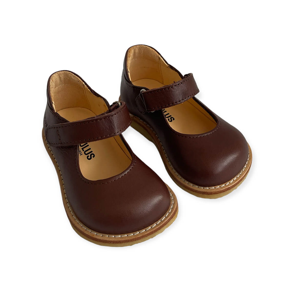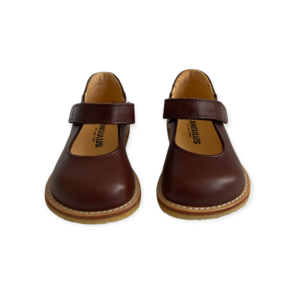 Leather starter shoes in a wide fit by Angulus. Starter Mary Jane shoe with adjustable velcro closure. Closed toe and solid heel cap for maximum support. Soft and flexible crepe rubber sole. Lined with 100% chrome-free leather.