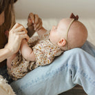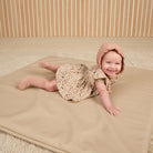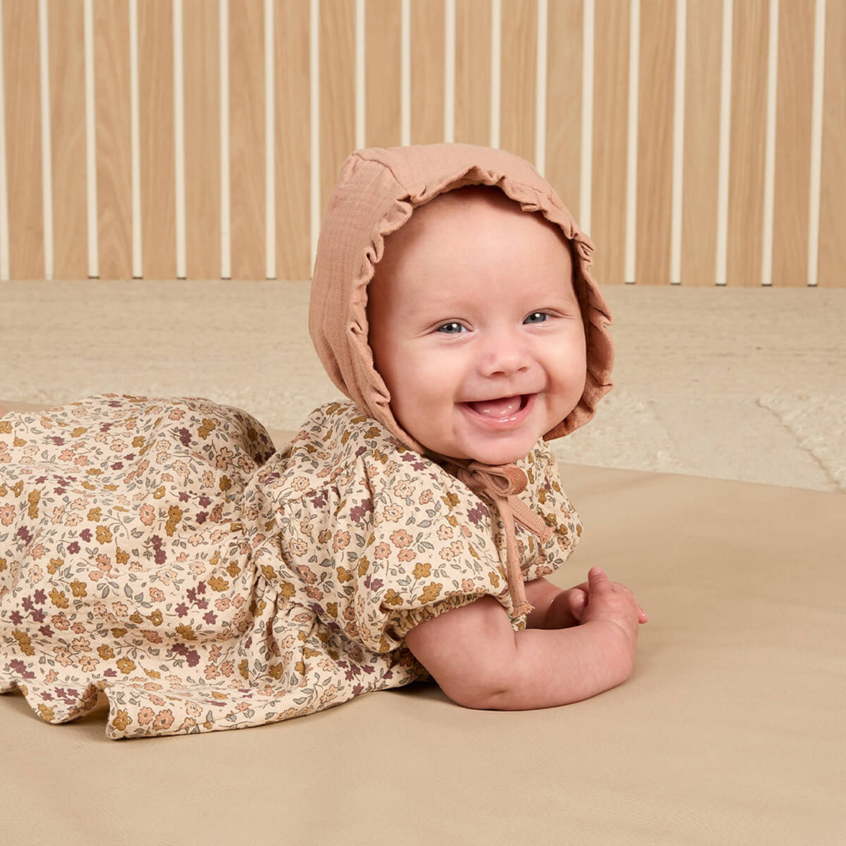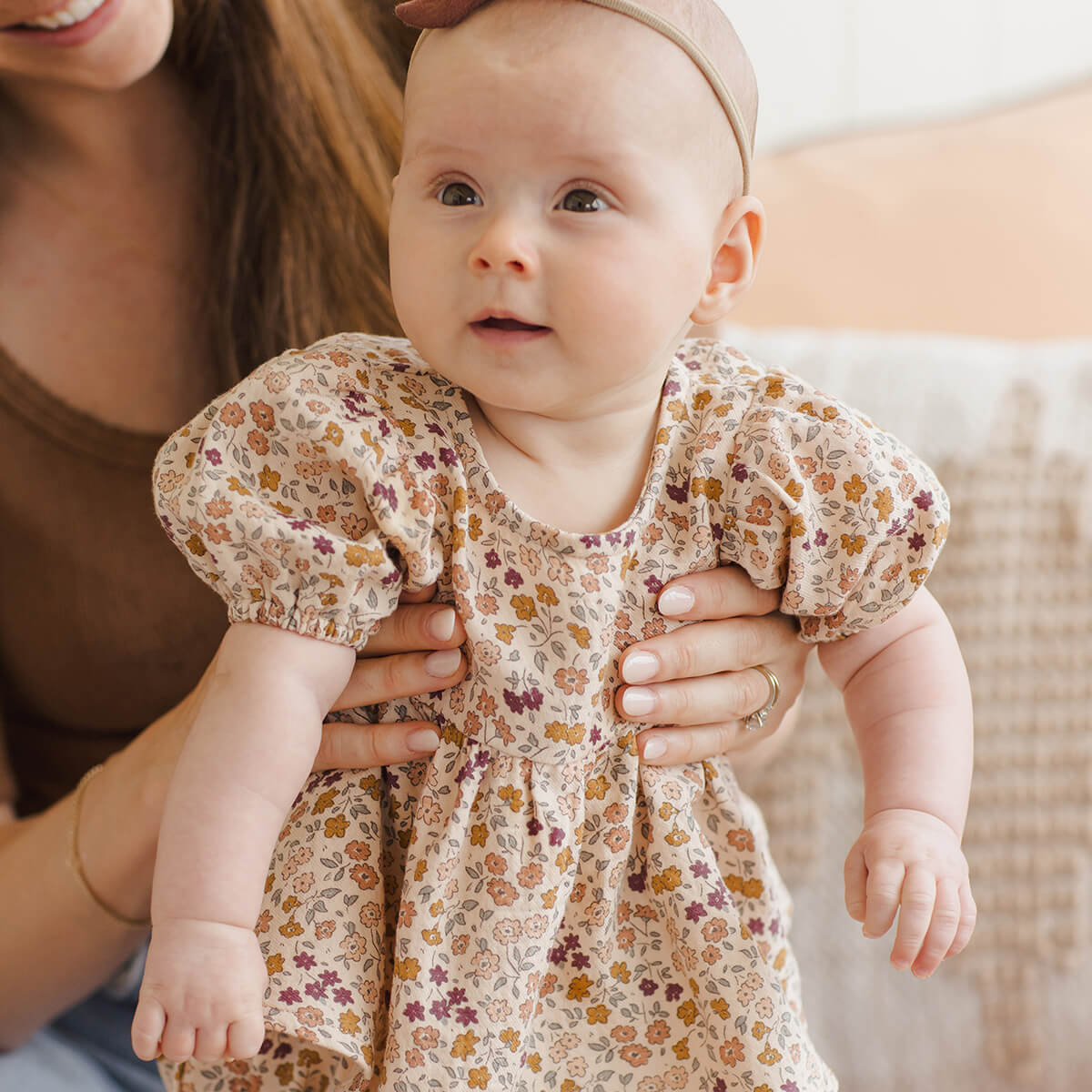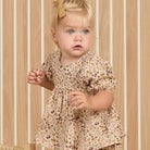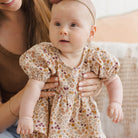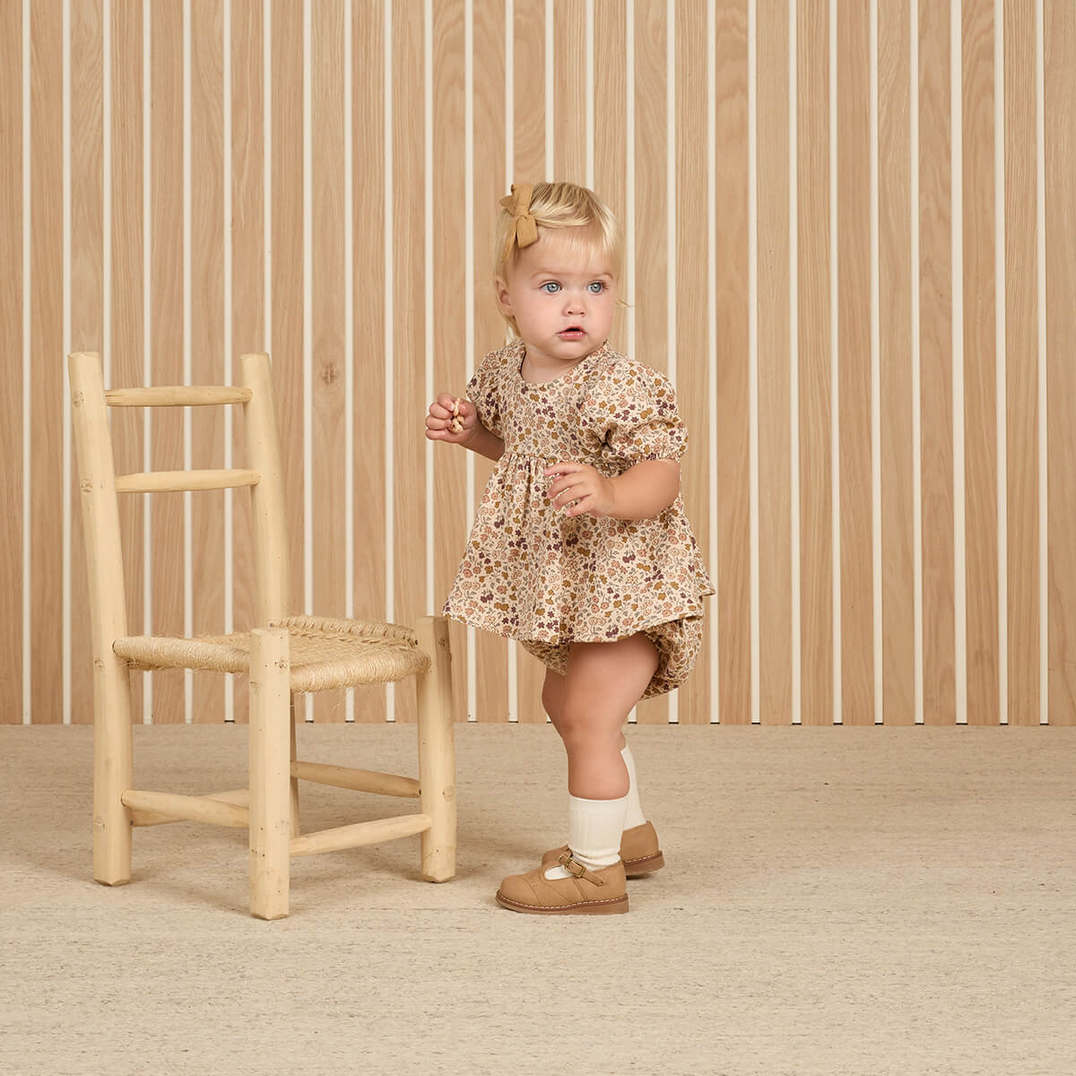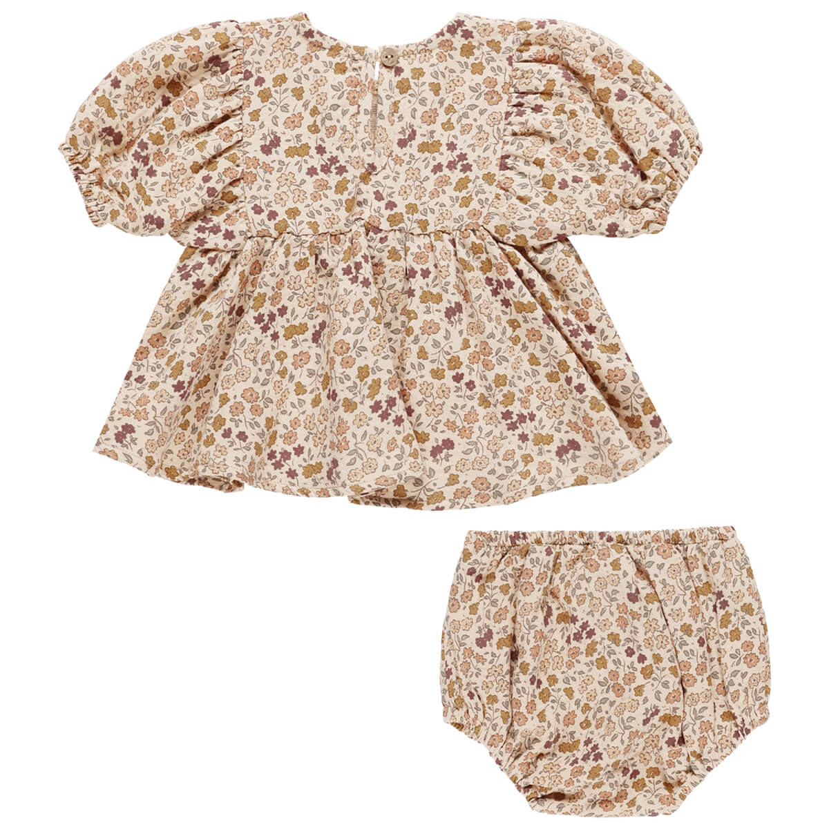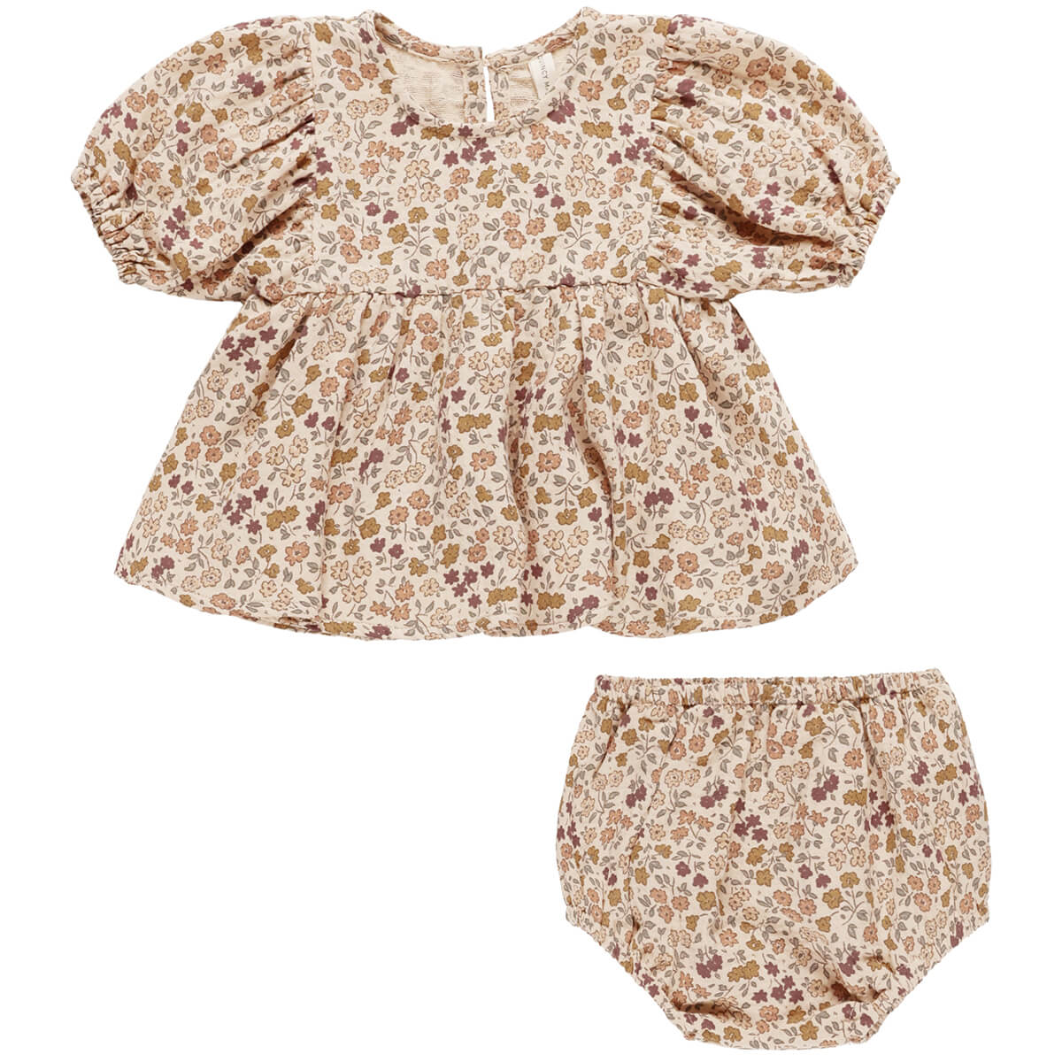 Francy Set by Quincy Mae. The Francy Set features an empire waist dress with balloon sleeves and a coconut button keyhole. It also includes matching baby bloomers.