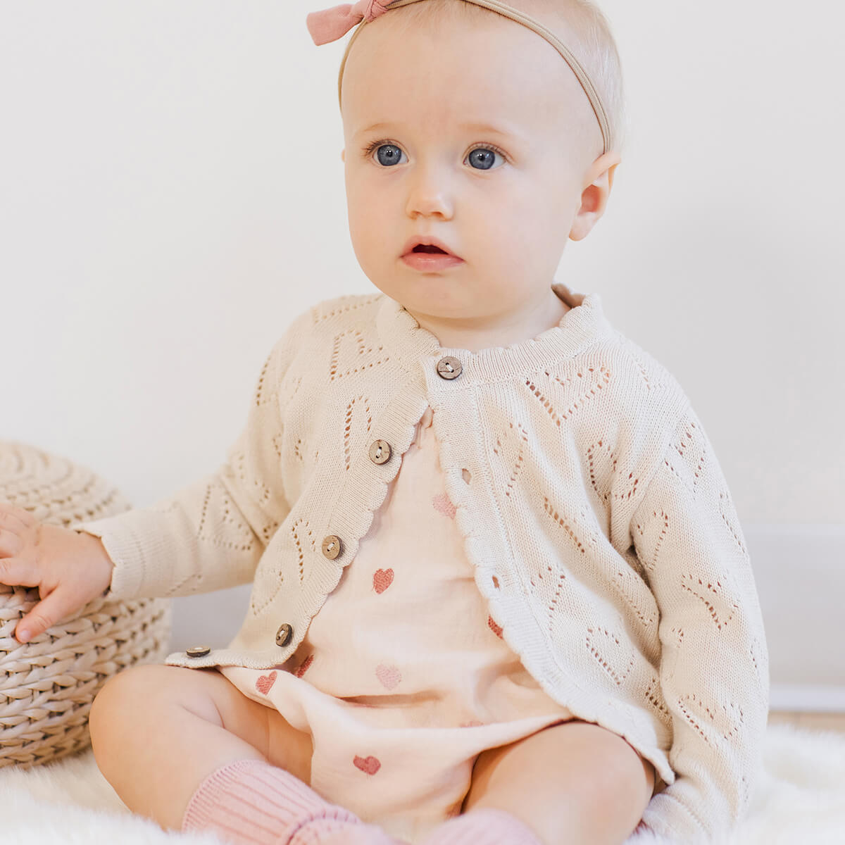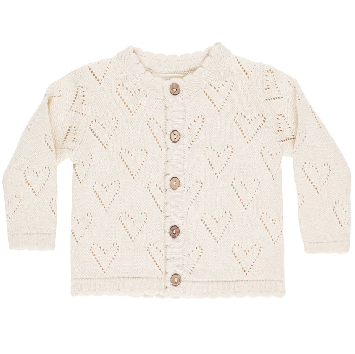 Knit Cardigan by Quincy Mae. A pointelle knit cardigan with scallop trims and coconut buttons.