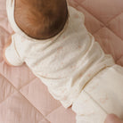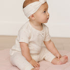 Pointelle tee and legging set by Quincy Mae. Long sleeve t shirt and leggings set with an elastic waistband and faux shell buttons at centre front.