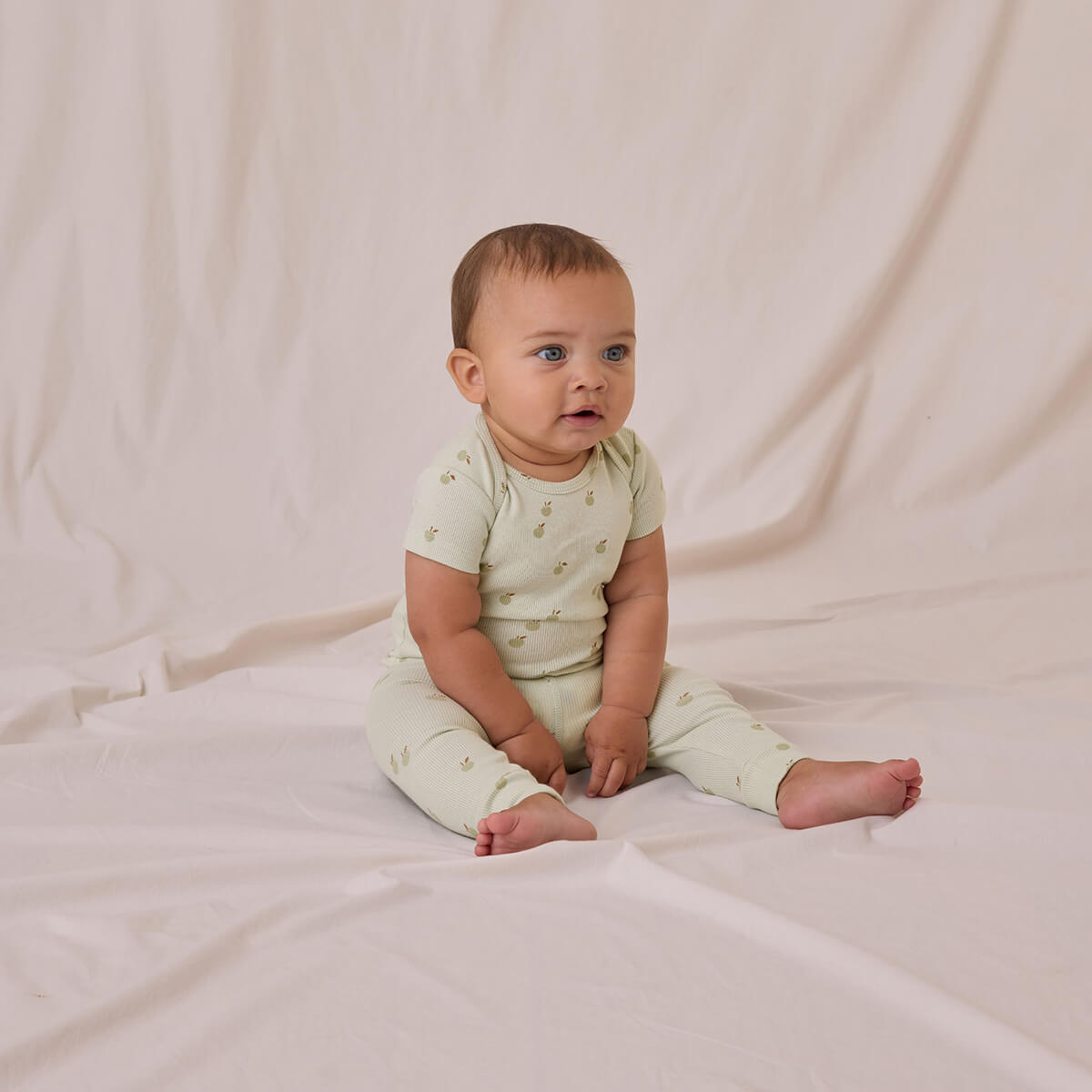 Ribbed tee and legging set by Quincy Mae. Short sleeved t-shirt top and a pair of leggings in a stretchy rib knit. Slim fit with added stretch to grow with your baby.