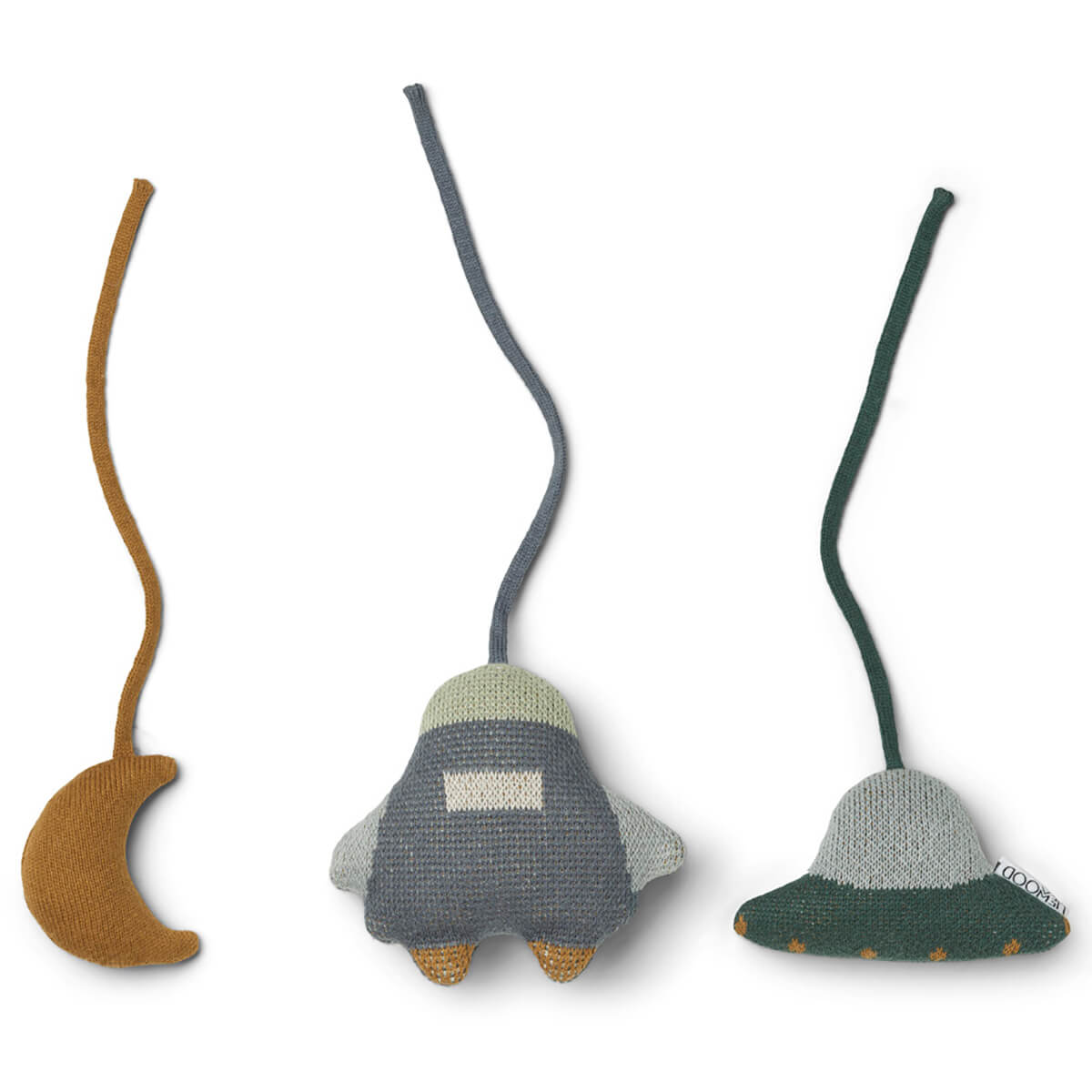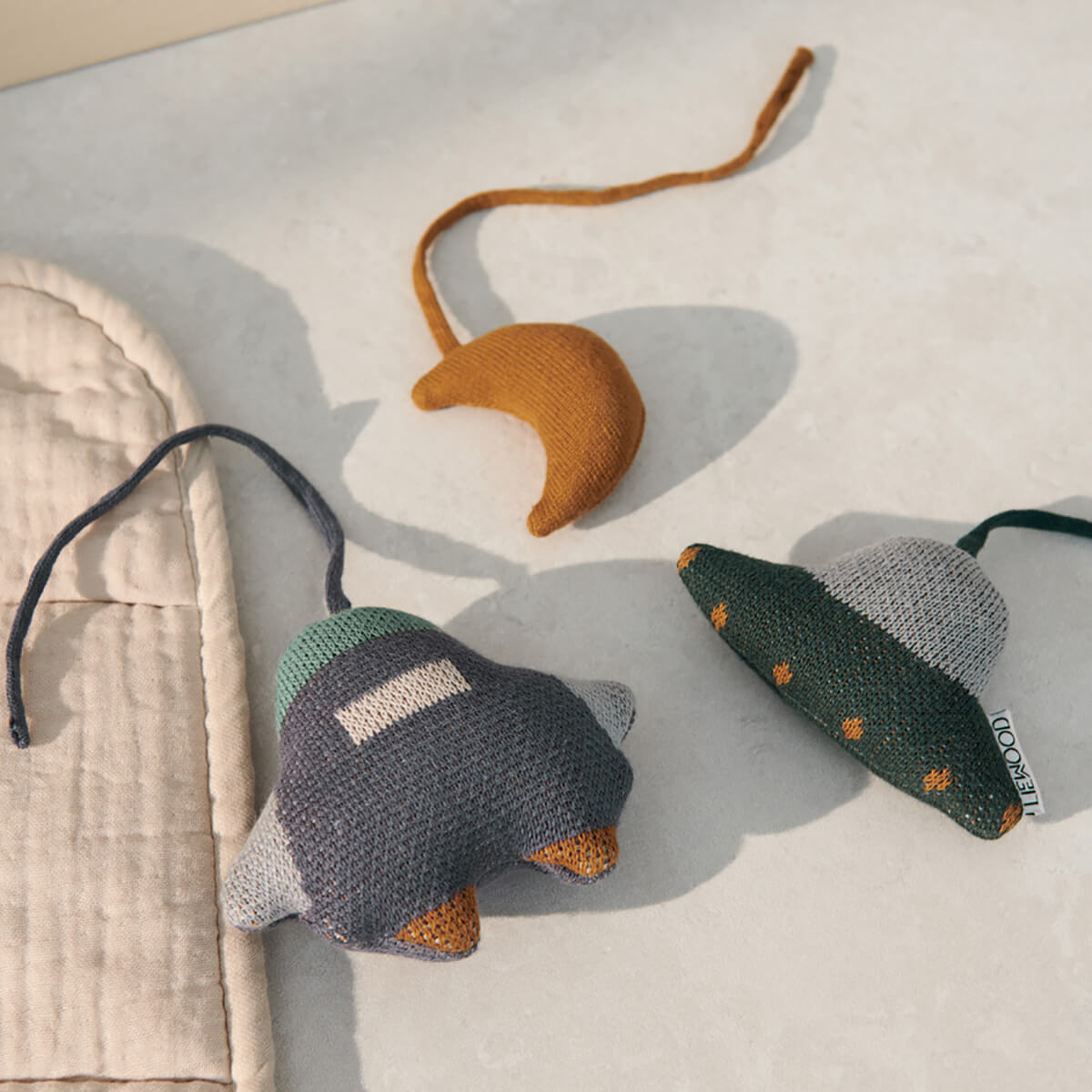 Knitted space-themed baby gym toys by Liewood. Cute knitted play gym toys, made of pure organic cotton. Keep your baby entertained with the cute accessories, which will train hand-eye coordination and spatiality.