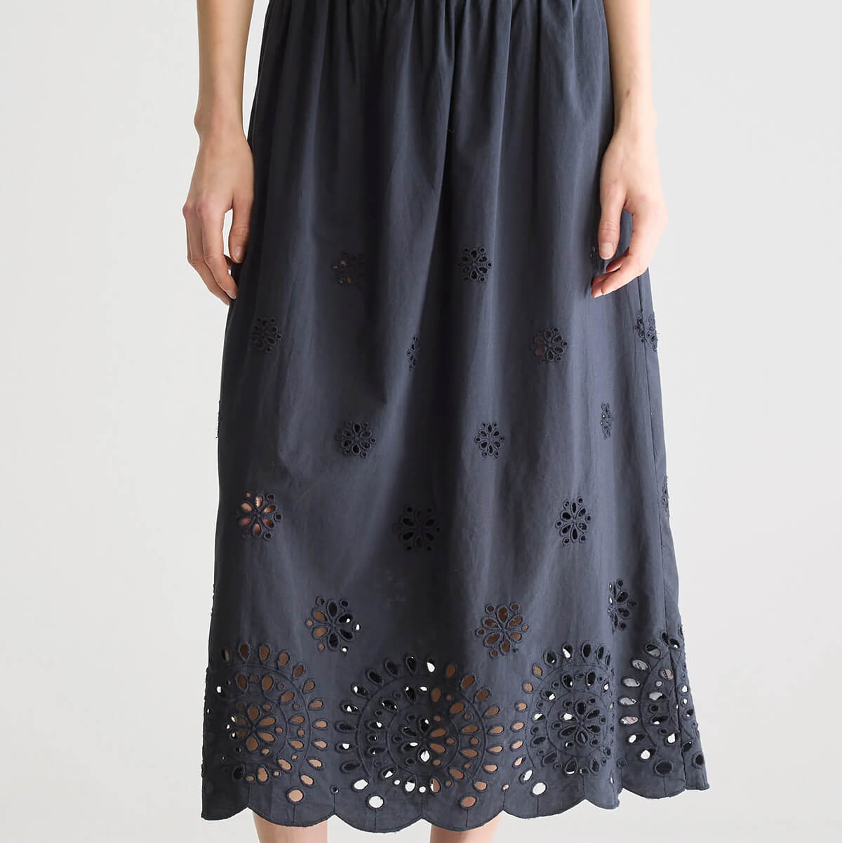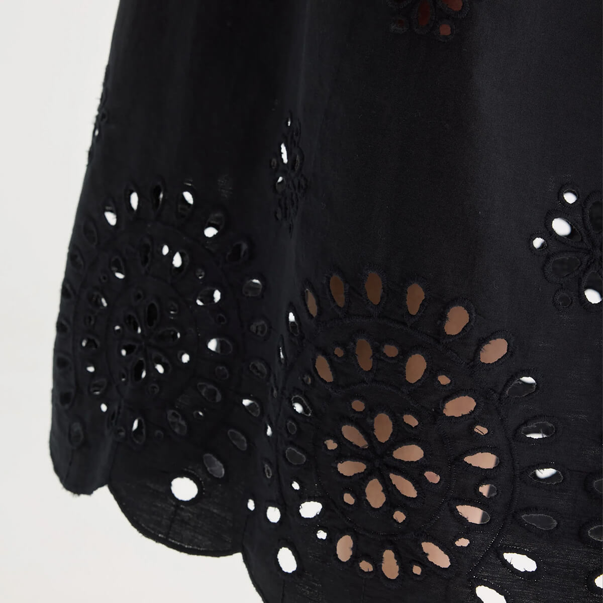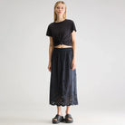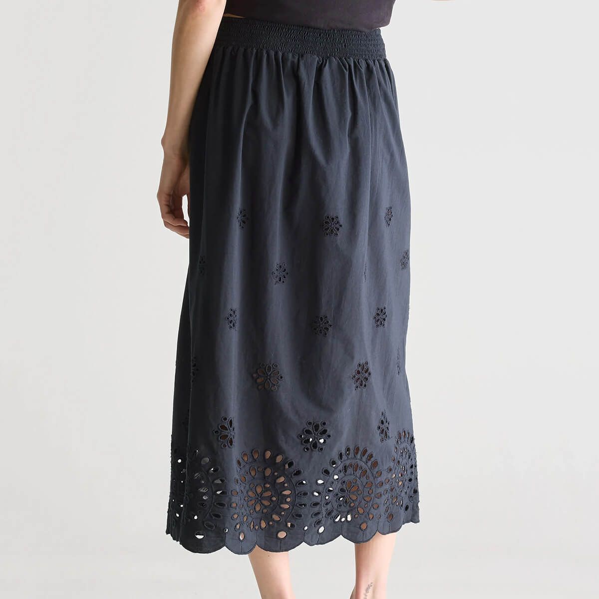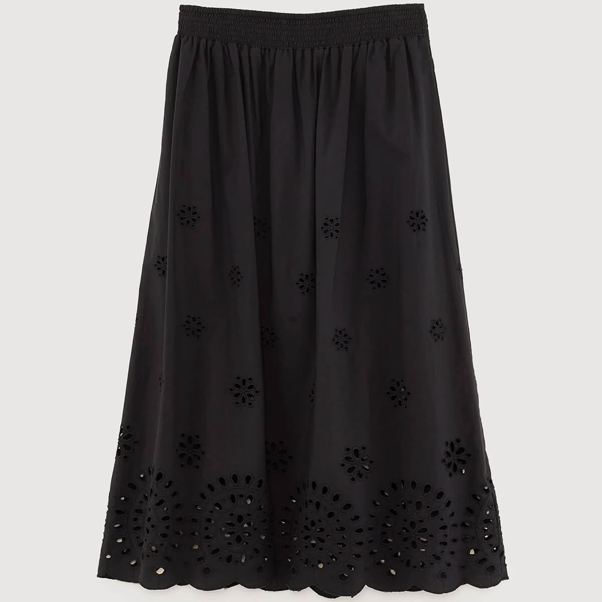 Dorine Midi Skirt by Bellerose. Black midi skirt made from Schiffli fabric with a scalloped hem and a elastic shirred waistband.