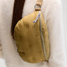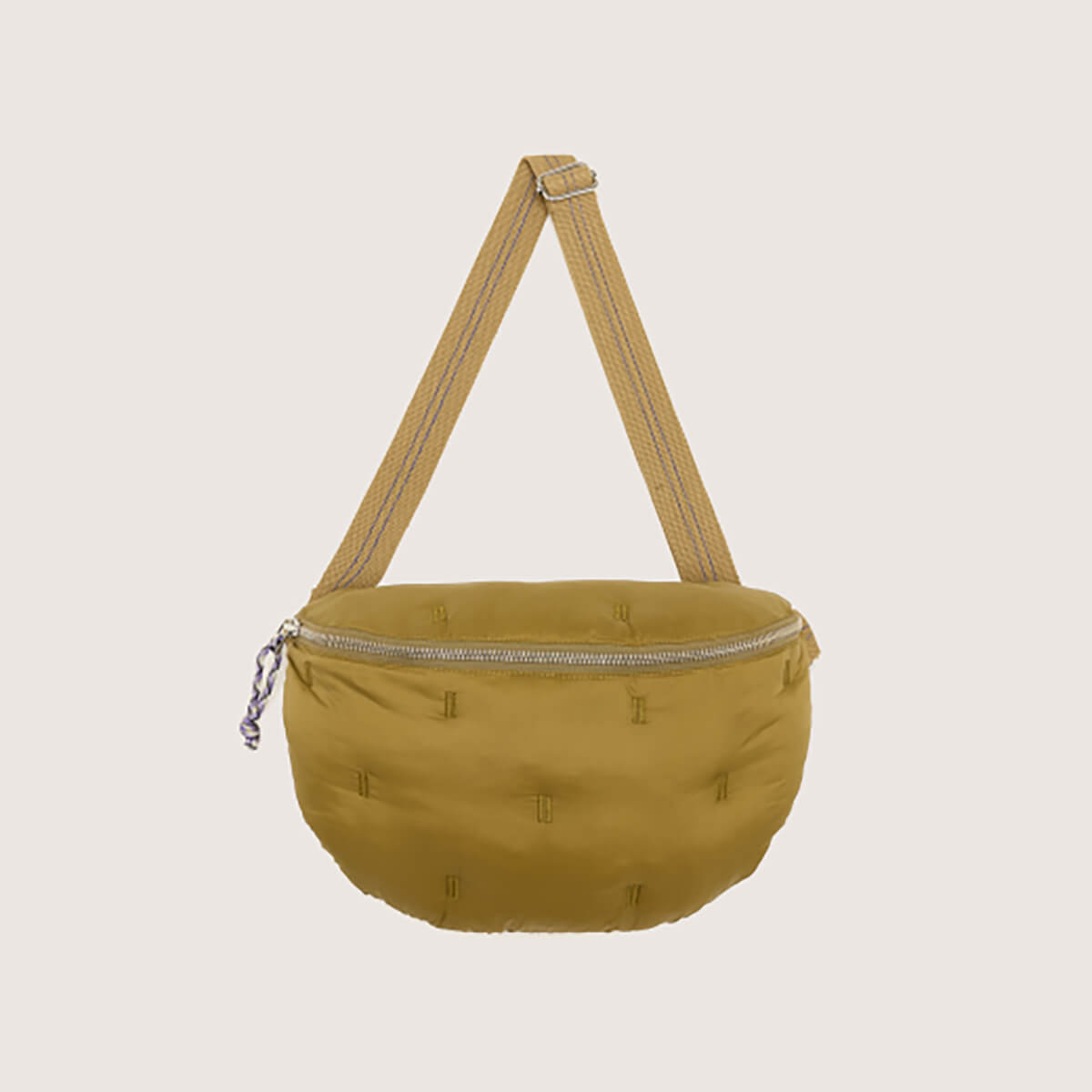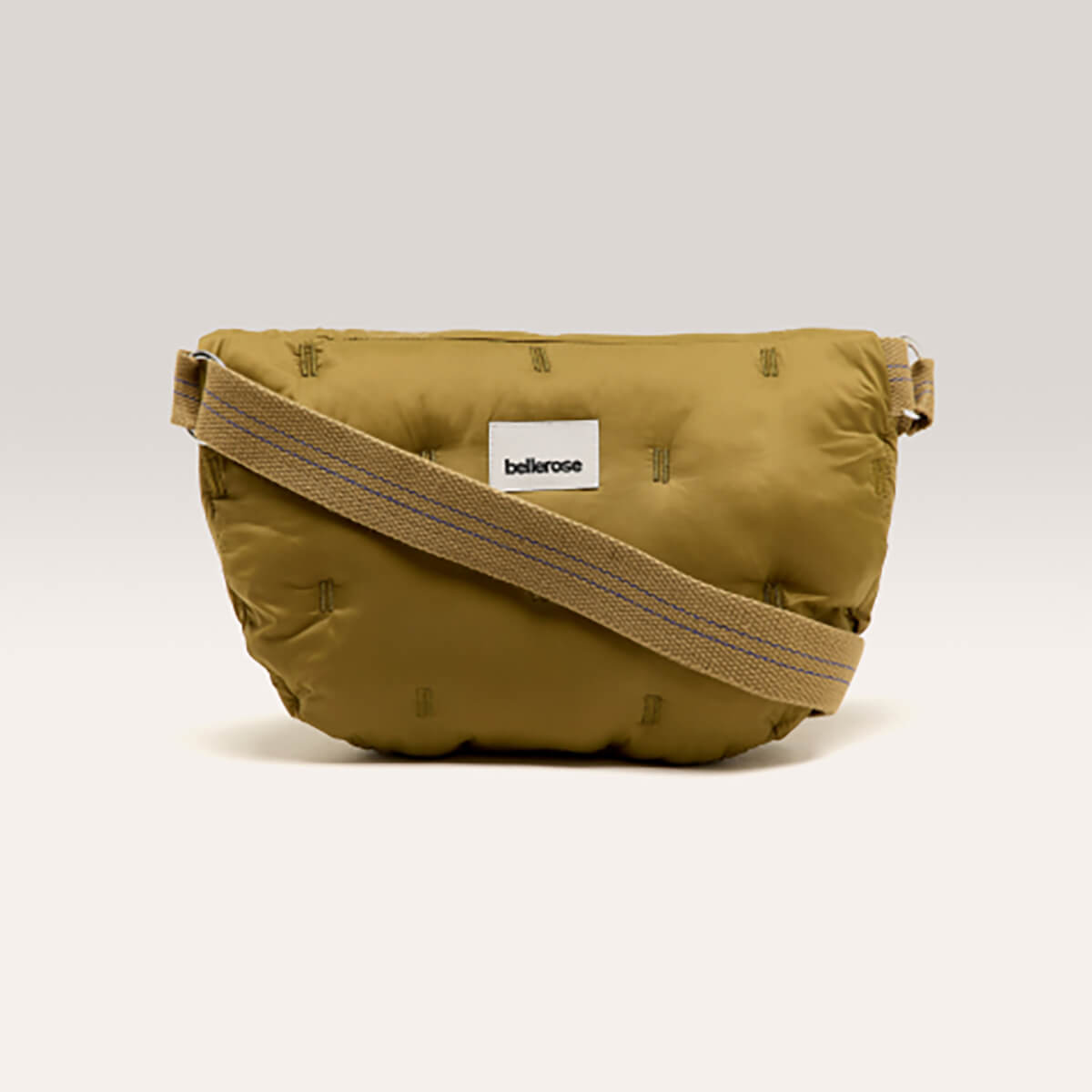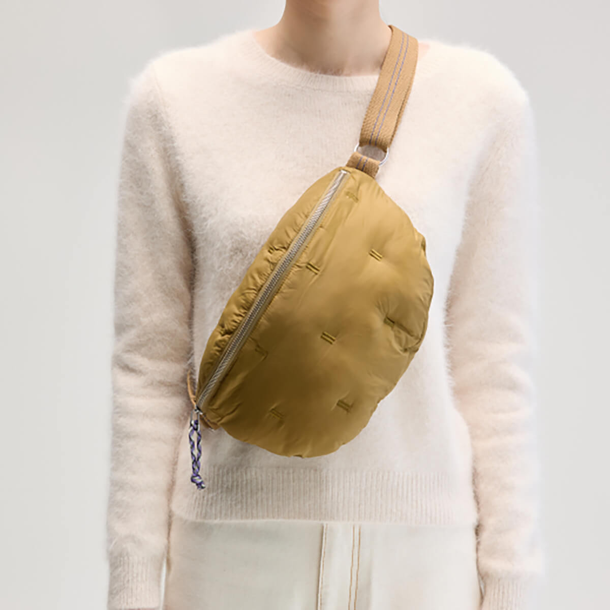 Hosie Bag by Bellerose. Zip-front sling bag in amber brown quilted nylon.