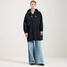 Laos Hooded Parka by Bellerose. Oversized hooded coat in navy blue canvas with raglan sleeves and elastic hems. Medium length and loose fit with a hood, zip front and snap button closure. Water repellent.