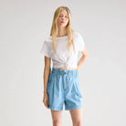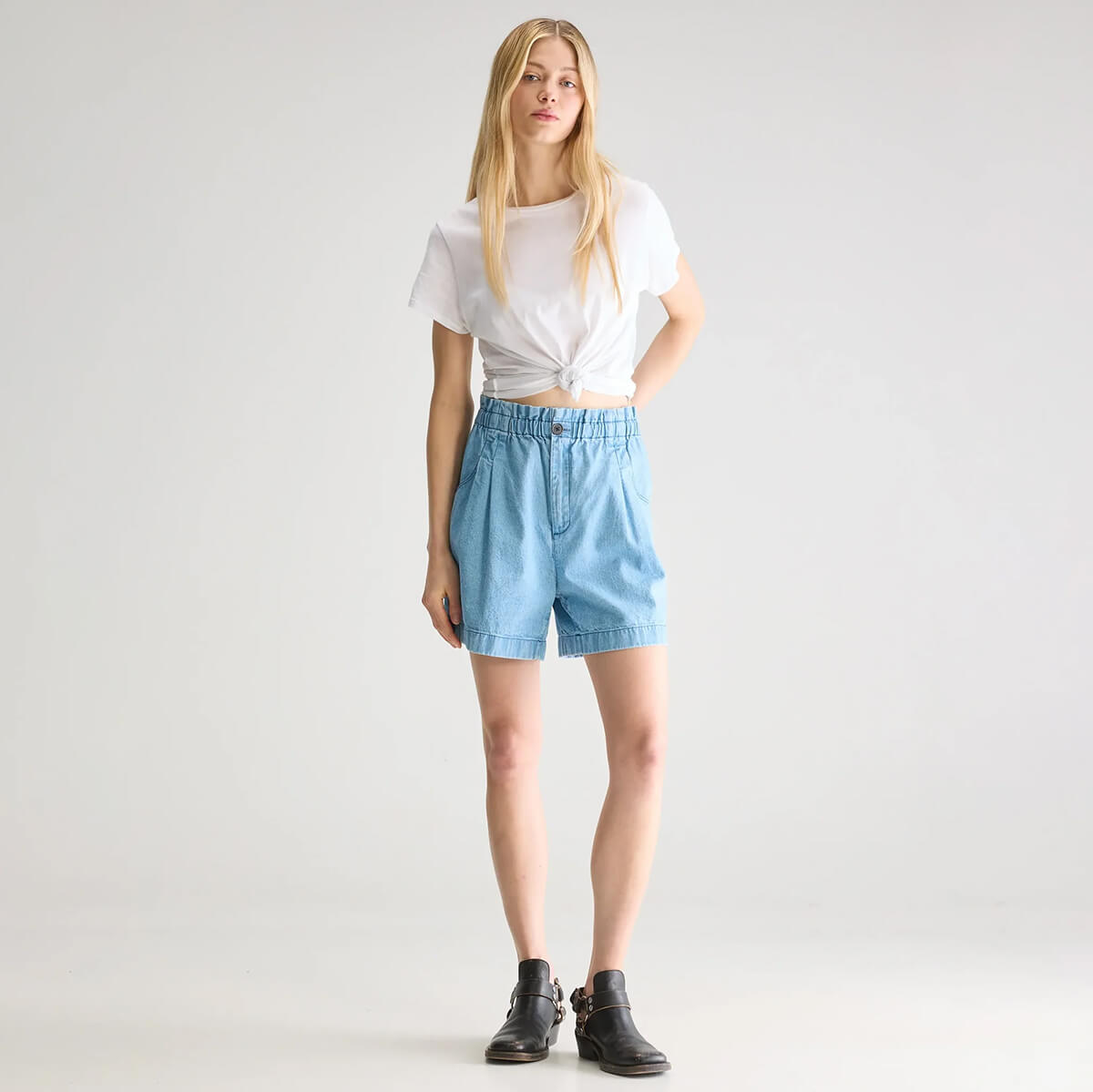 Willa Shorts by Bellerose. Relaxed paperbag waist shorts in light blue denim. Designed with a ruffled waistline, pleated detailing, and practical side and back pockets.
