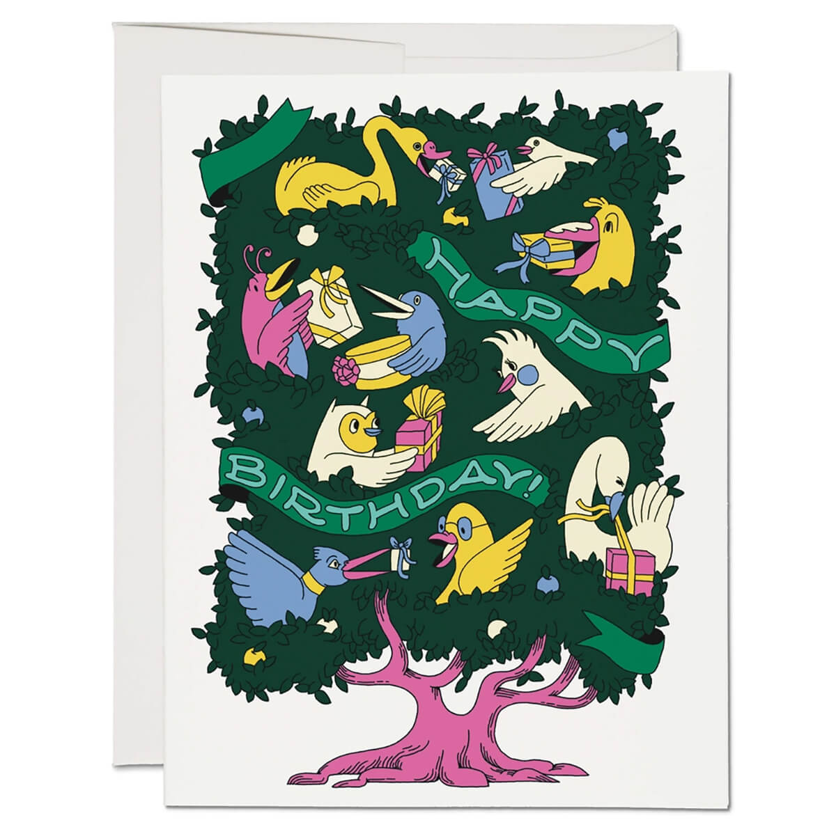 Birthday Birds greetings cards by Red Cap Cards. Features an illustration by Maddie Fischer. Printed in the USA on heavyweight card stock. Blank inside with white envelope.