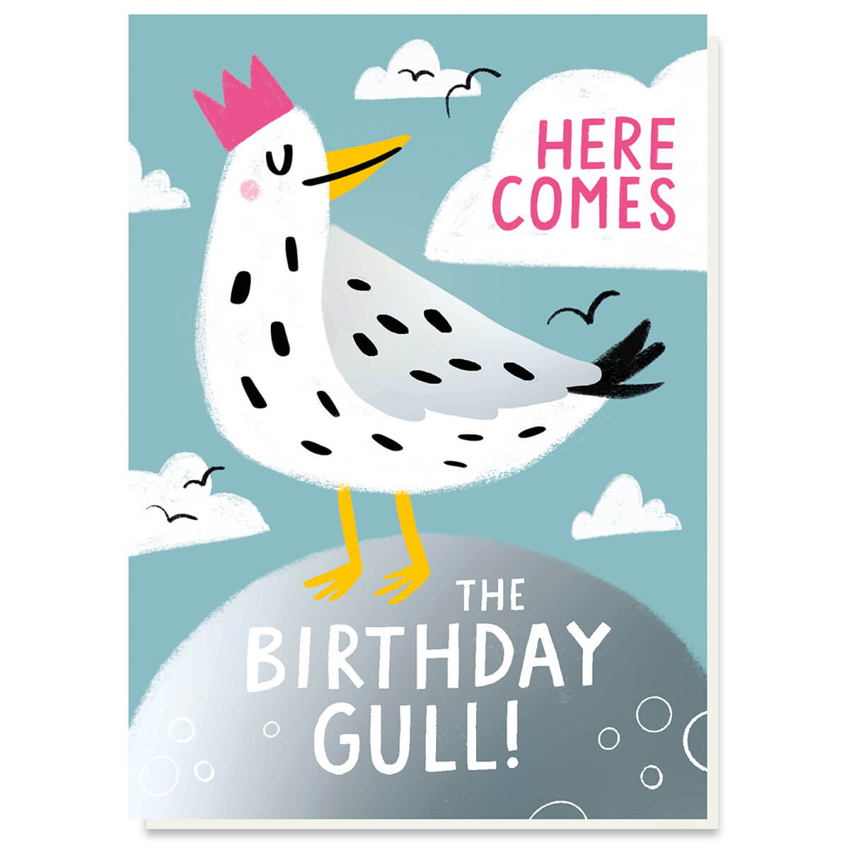 Birthday Gull Greetings Card by Stormy Knight. Features a fun seagull illustration by Sarah Jackson, founder of Stormy Knight. From the Shiny Things collection, this super fun and shiny design is finished with bold coloured satin foil to really stand out. Blank inside with a 100% recycled white envelope.
