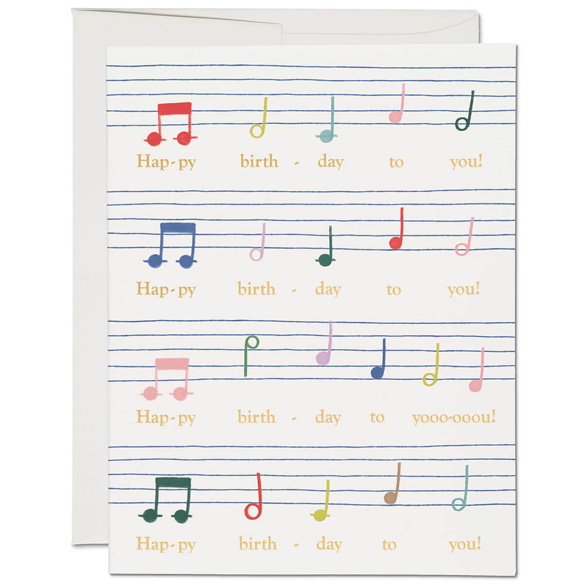 Birthday song greetings card by Red Cap Cards. Features an illustration by The House That Lars Built. Printed in the USA on heavyweight card stock. Blank inside with white envelope.