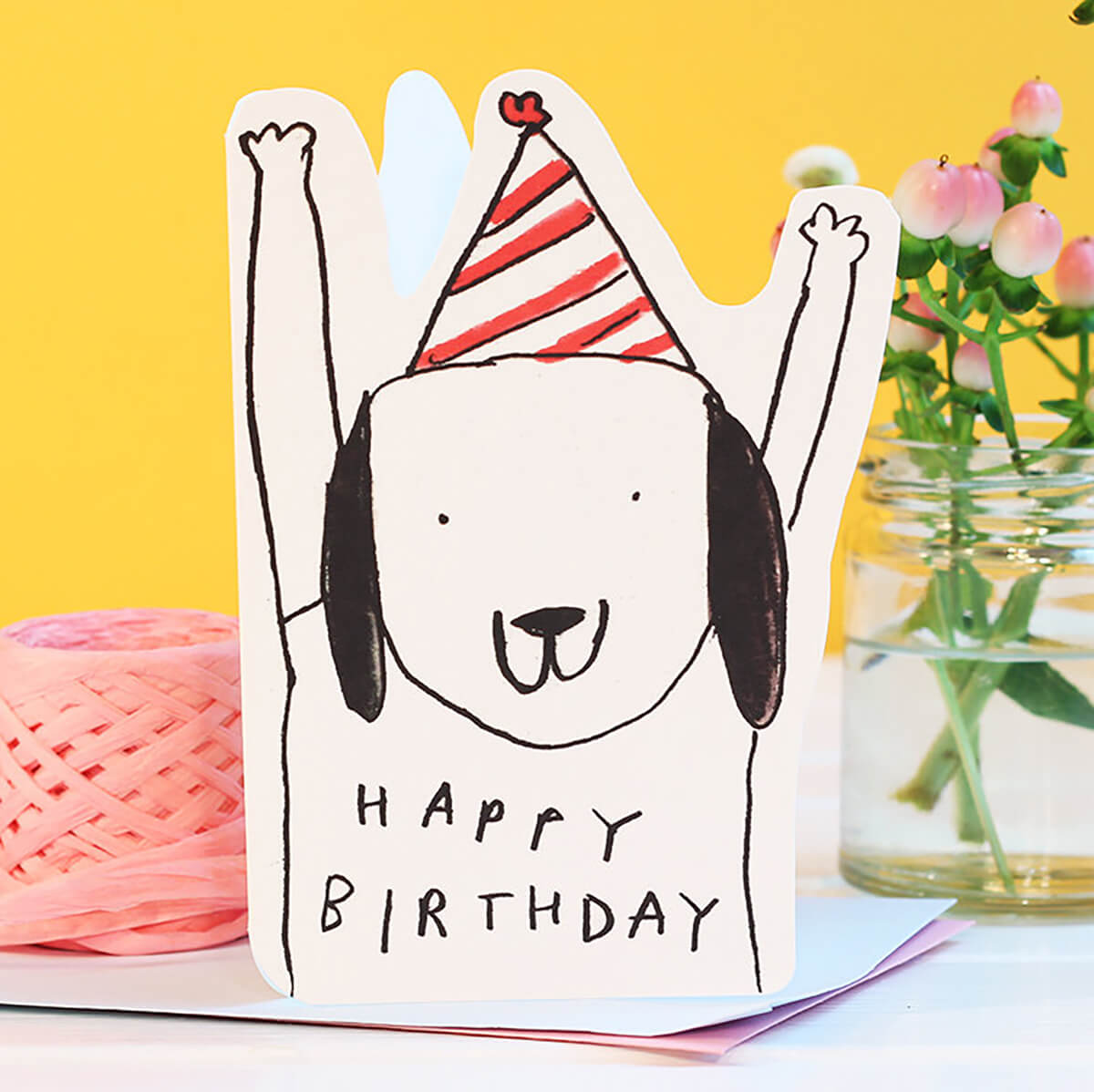 Cut Out Dog Birthday Greetings Card by Laura Skilbeck Cards. Bring the birthday joy with this happy party dog.