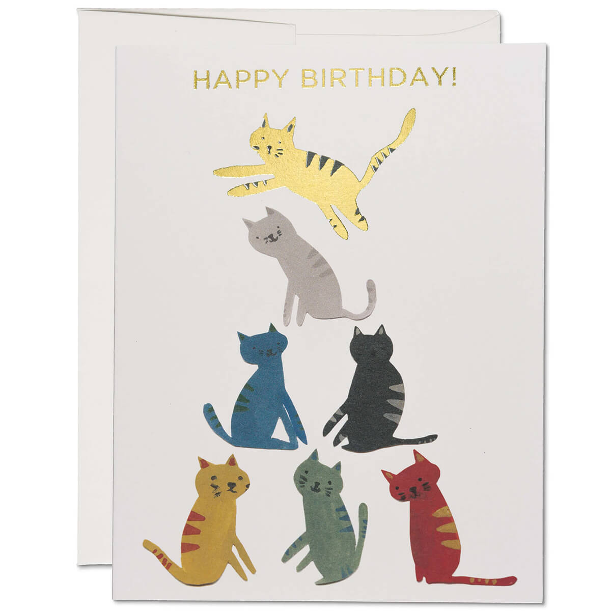 Gold kitty birthday greetings card by Red Cap Cards. Features an illustration by Blanca Gómez. Printed in the USA on heavyweight card stock. Blank inside with white envelope.