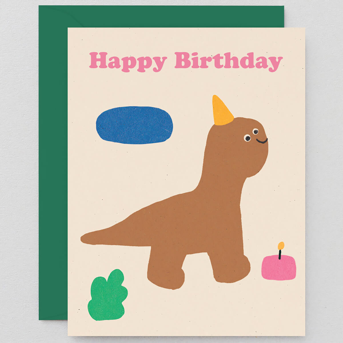 Happy Birthday Dino greetings card by Maria Ramos for Wrap. Features an illustration by Maria Ramos. Blank inside with an emerald green envelope.