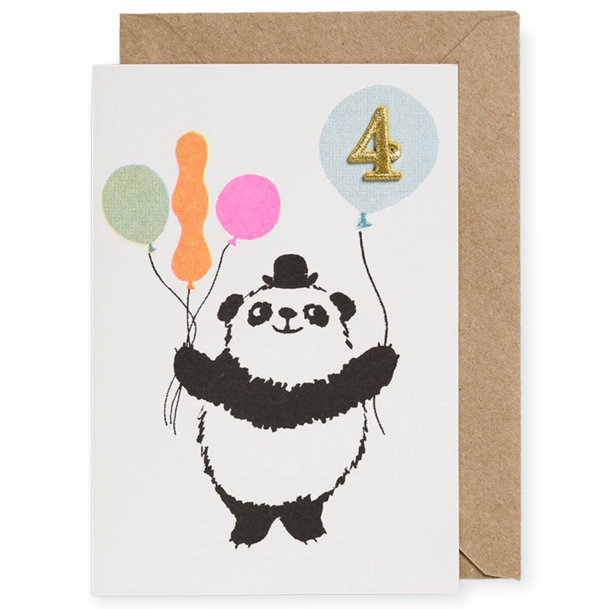 Panda embroidered age greetings card by Petra Boase.  Embellished with a embroidered gold number 4. Blank inside for your own message.