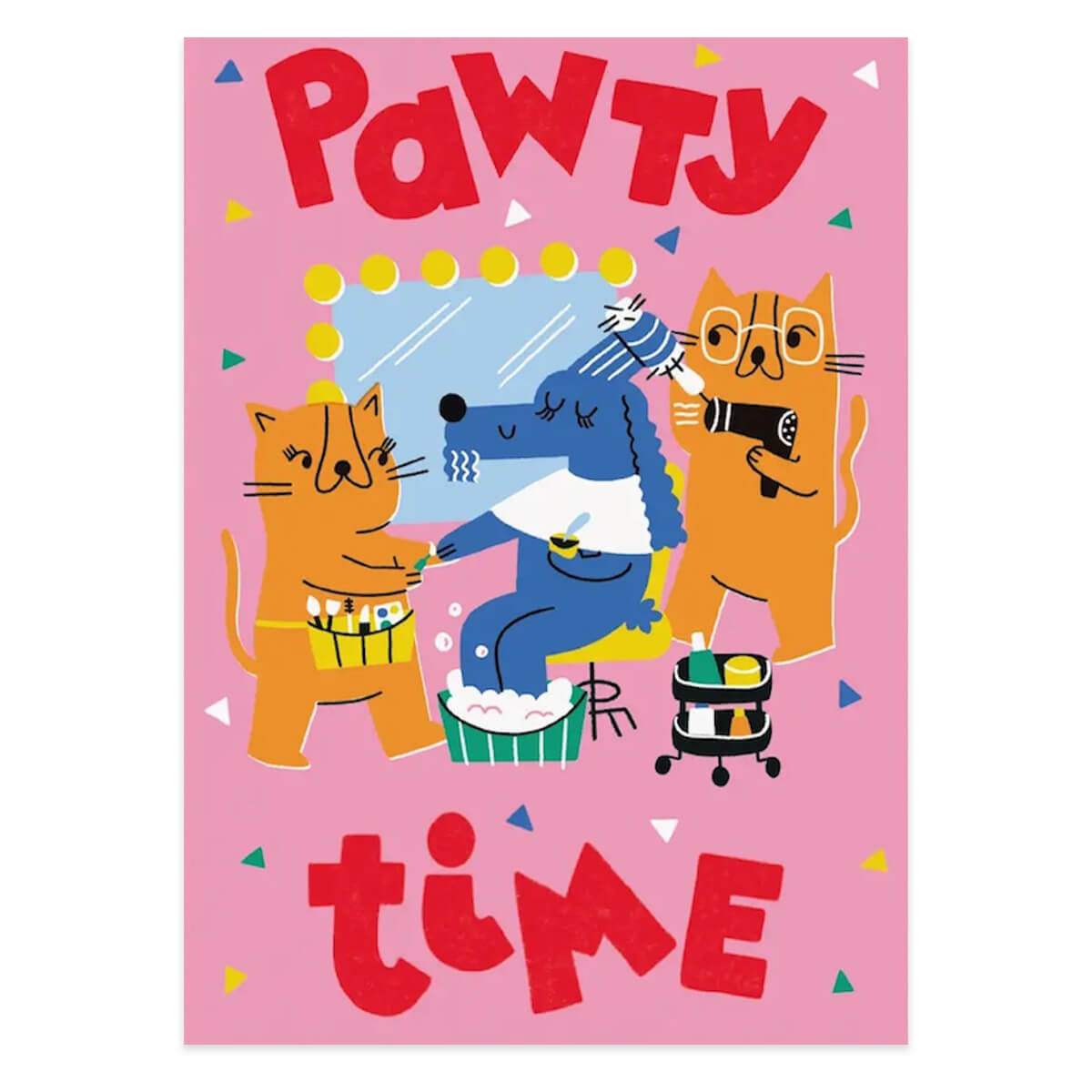 Pawty Time Birthday greetings card by Studio Boketto. A duo of ginger cats are working hard to get this blue puppy ready for "Pawty Time"! Equipped with everything required for a full makeover, the creatures on this animal birthday card know the meaning of the word 'pamper'. The colourful illustrated design is perfect as a children's birthday card or for fun-loving adults - add a handwritten message on the blank inside to personalise the birthday card for any recipient.