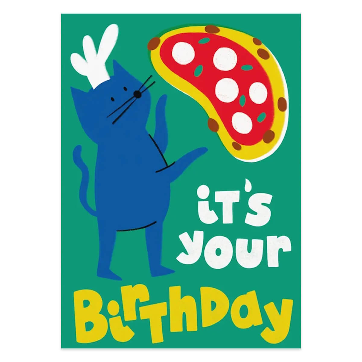Pizzeria Cat Birthday greetings card by Studio Boketto. Bellissimo! Who knew that our furry feline friends were also amazing pizza chefs? A blue cat wearing a chef's hat expertly tosses a pizza on this colourful birthday card illustrated by Isa Parracas, next to the large caption reading "It's your birthday". The inside of the cat card is blank, ready for you to add a handwritten message.