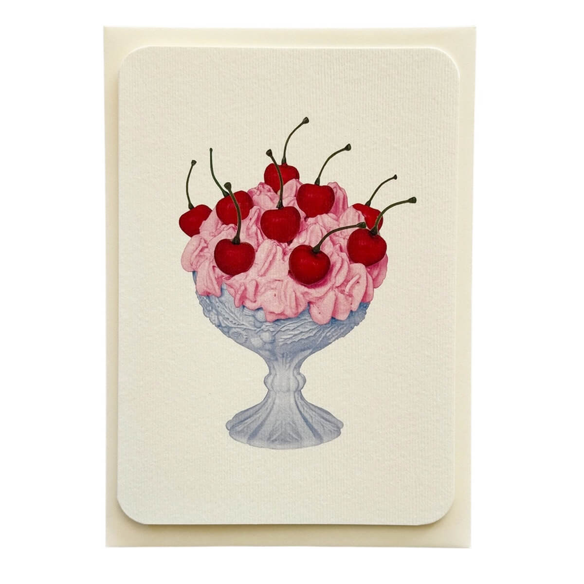 Strawberry Chantilly Cream Greetings Card by Canonbury Press. Whipped cream, pastel tones and nostalgic pudding table charm. This still life card evokes teatime indulgence, captured by Alexandra Simms. Photographed by Alexandra Simms and printed in England on luxurious Italian-milled card. Perfect for food lovers, dinner parties or as an elegant touch to any gift.