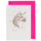 Unicorn head iron on patch greetings card by Petra Boase.  Printed card featuring a richly embroidered colourful patch.  The patch has an iron-on backing so can be removed from the card and ironed on to a favourite t-shirt, rucksack or whatever you like! Blank inside for your own message.