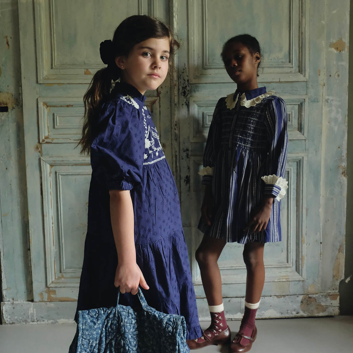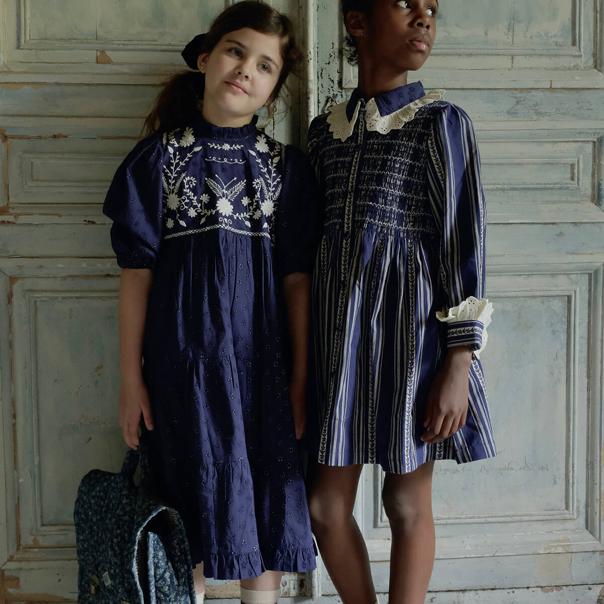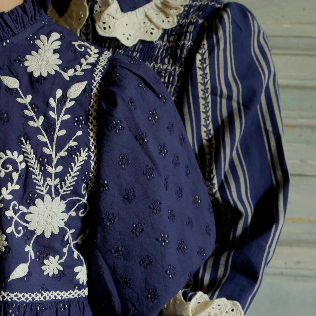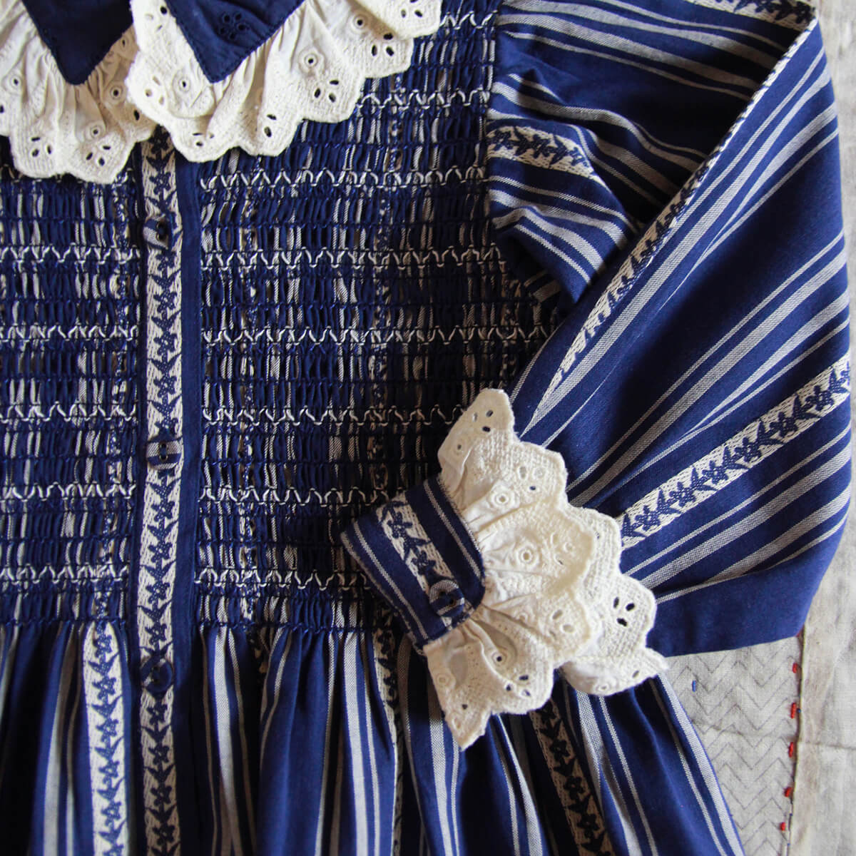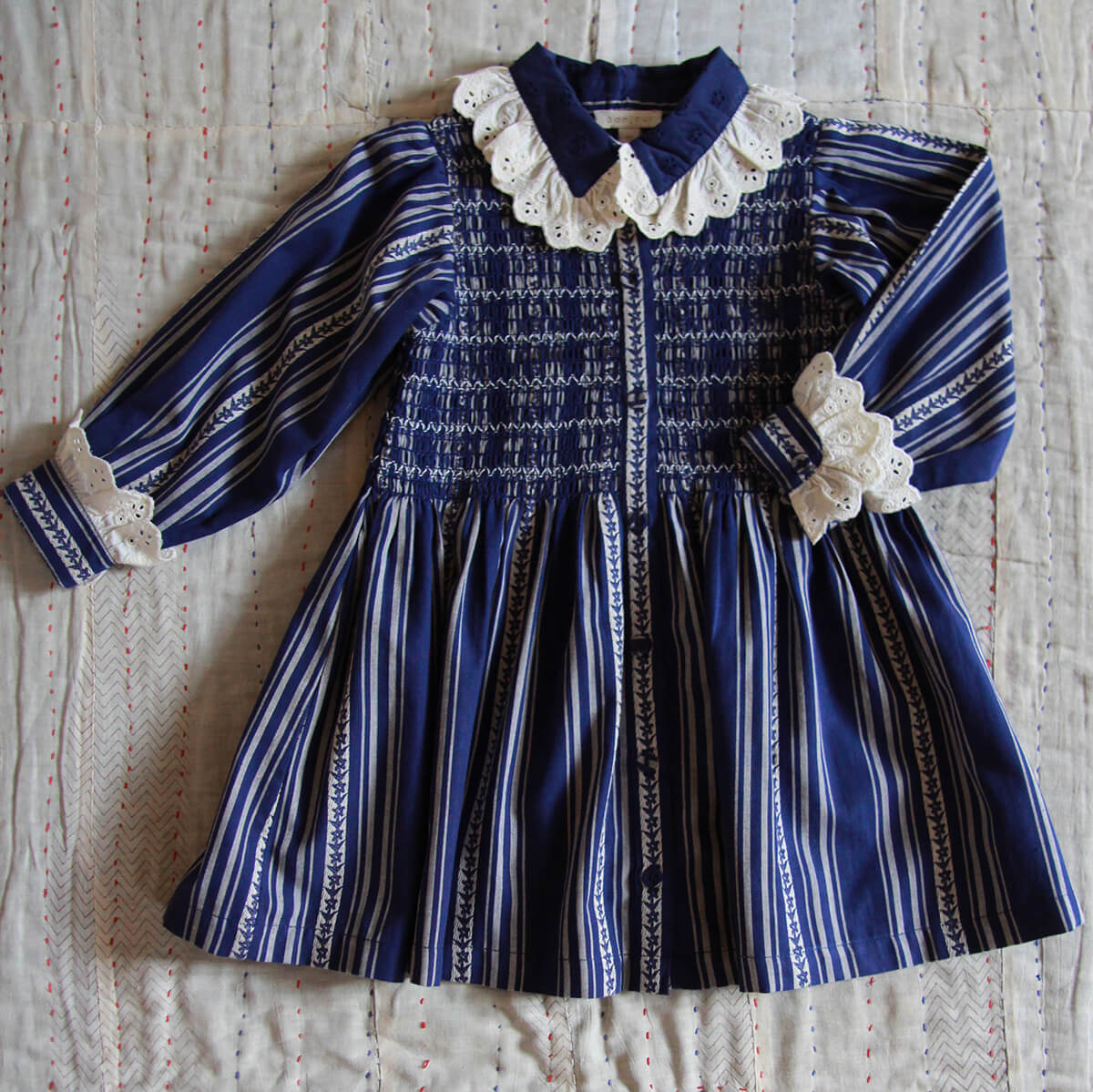 Long Tunique by Bonjour. A mid length dress with Bonjour's signature smocking at the chest and broderie anglaise lace details on the neck and cuffs.