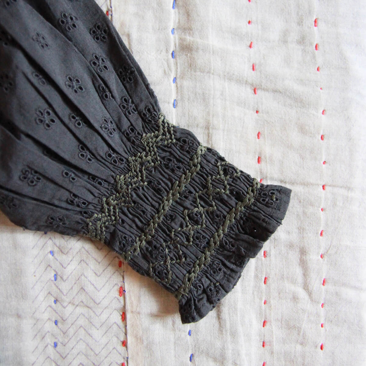 Yse Dress by Bonjour. A long broderie anglaise dress with balloon sleeves, flounce at the neck and Bonjour's signature smocking at the chest.