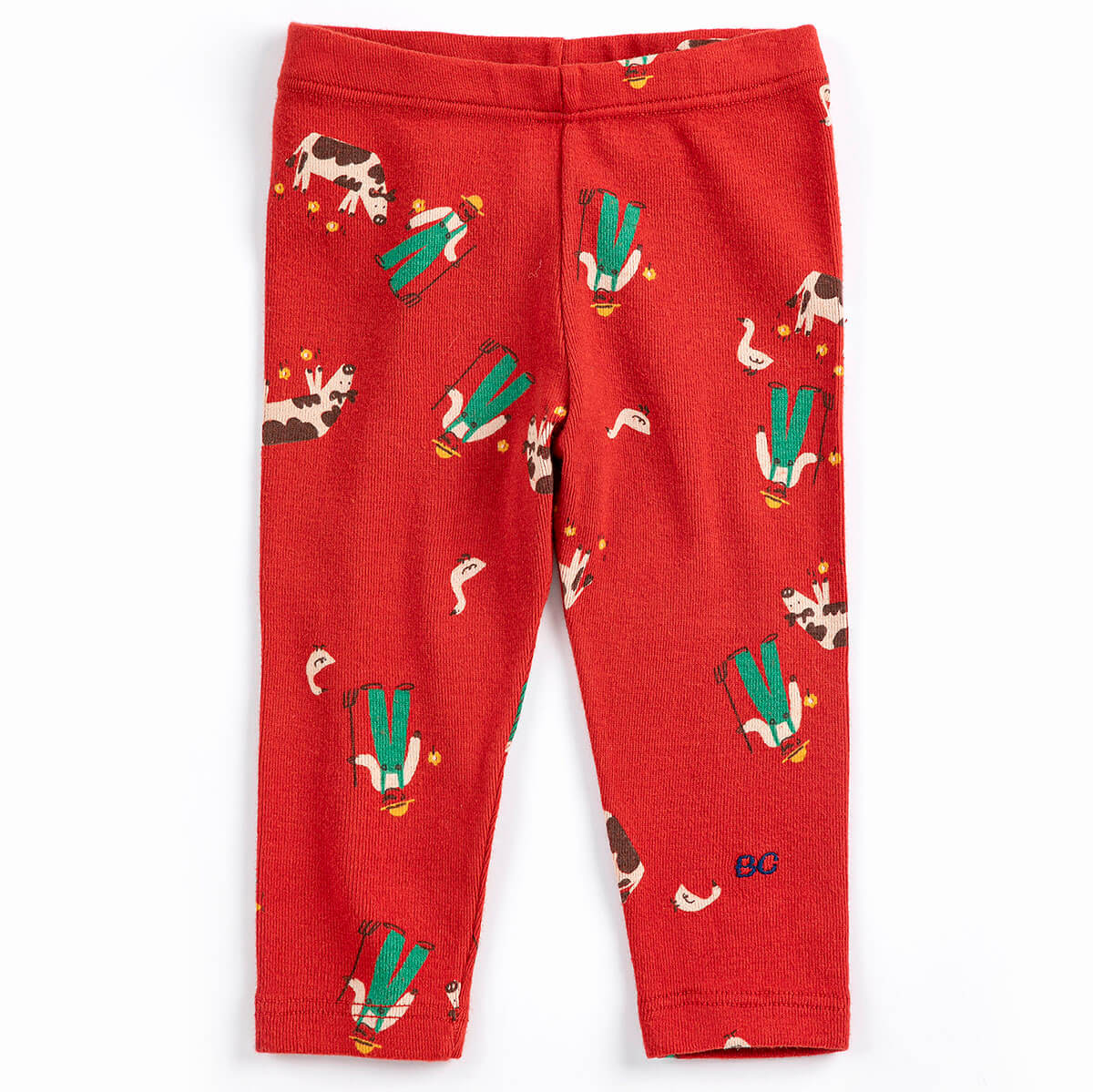 Farm Adventure All Over Baby Leggings by Bobo Choses. Red pants with a playful all over farm print. Designed with an elasticated waistband, slim fit and ankle length.