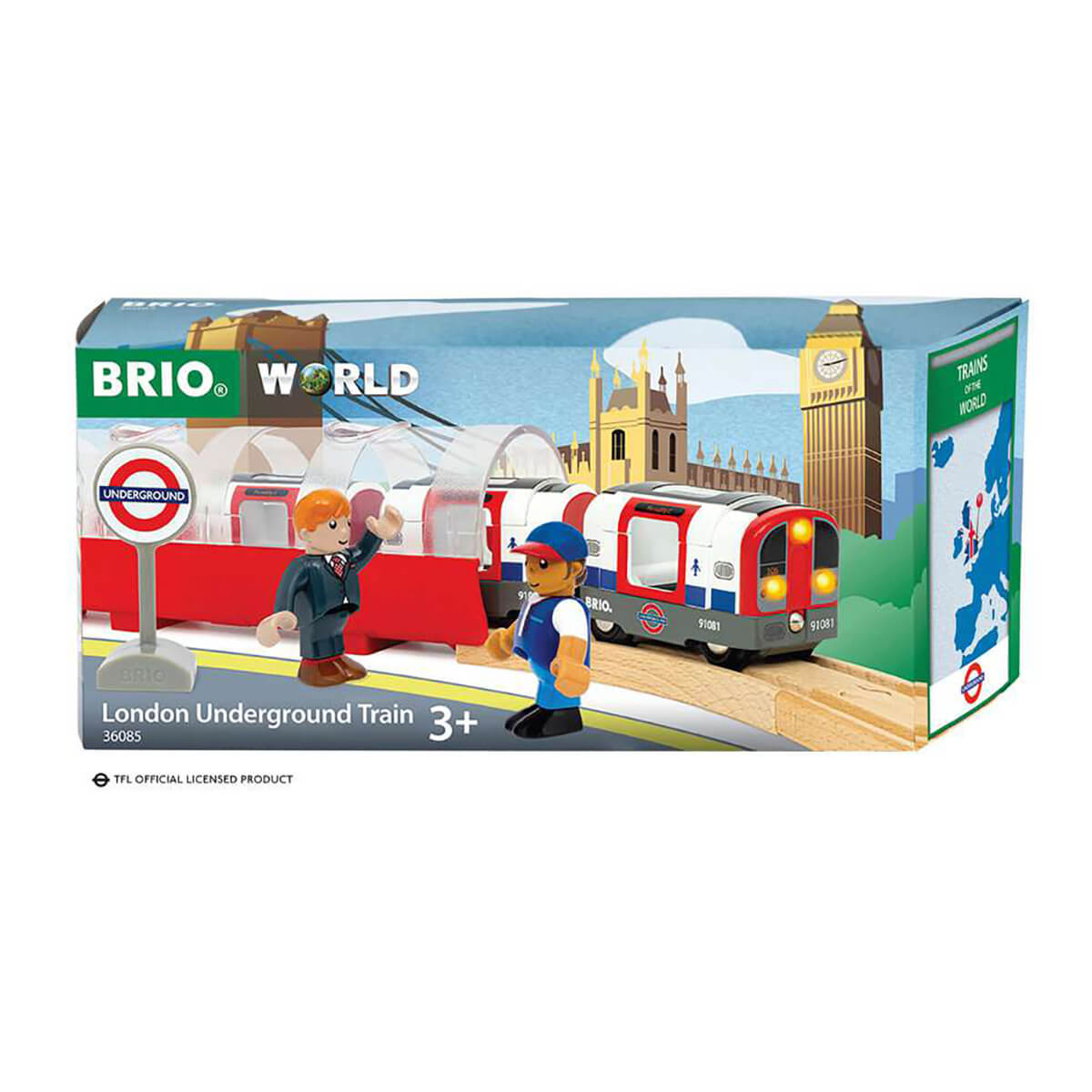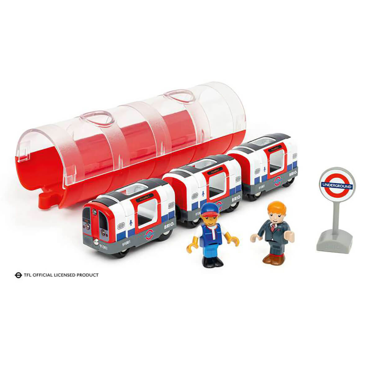 London Underground Train by Brio. Mind the gap as you board the London Underground Train – part of the Trains of the World series. This metro train set includes the iconic red, white and blue train, a tube tunnel and two characters. Push the train to activate its lights and sounds and recreate the London Underground experience, which first opened in 1863.