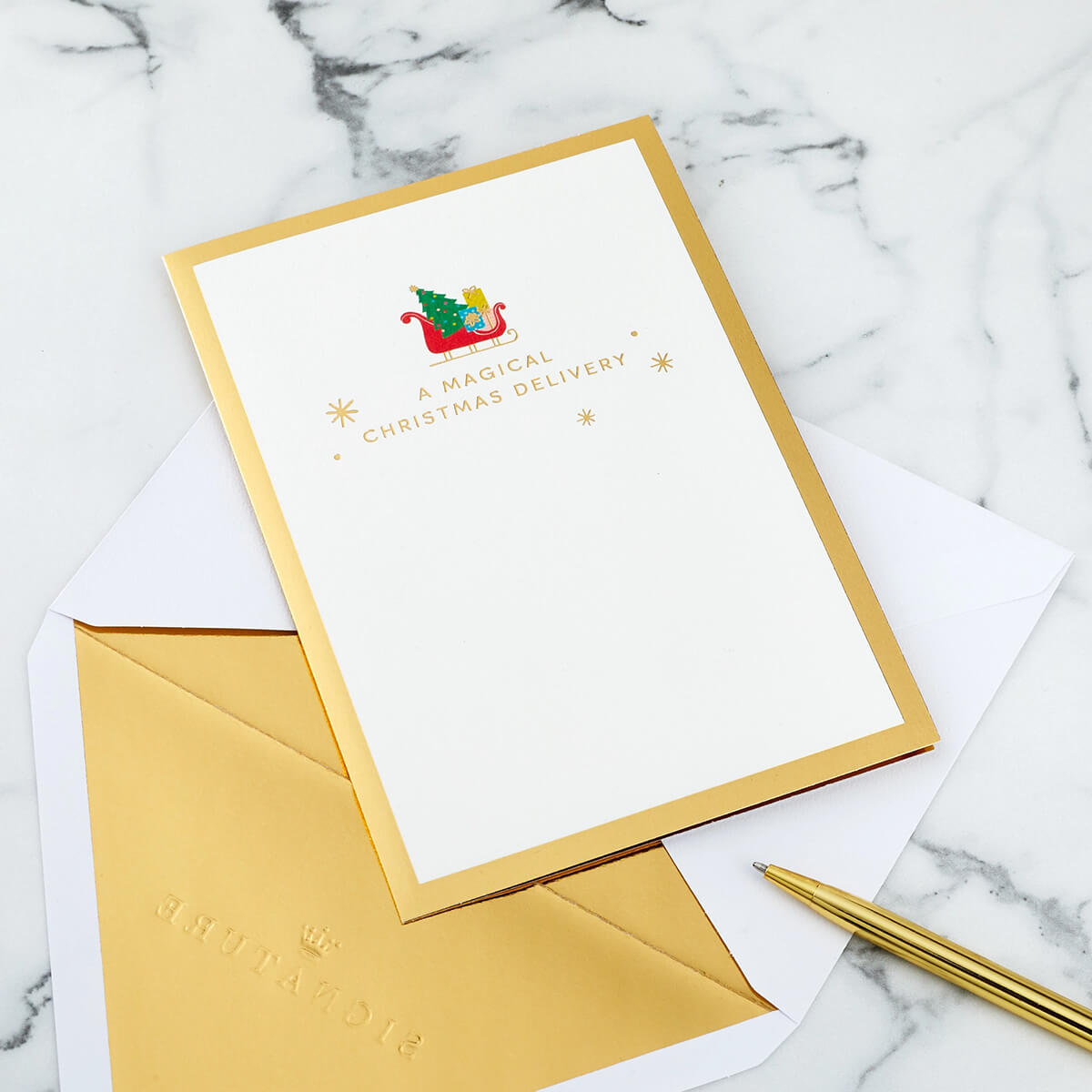 This card features the message 'A Magical Christmas Delivery' and comes complete with a co-ordinating Hallmark branded, gold foil envelope. Message Inside: Hope you get everything you're wishing for!