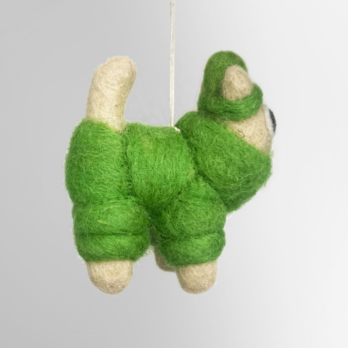 Lee Cat In Green Puffa Outfit Felt Decoration by Wrap. Hand needle felted hanging Christmas tree decoration. Lee the cat is staying cosy in his puffa outfit.