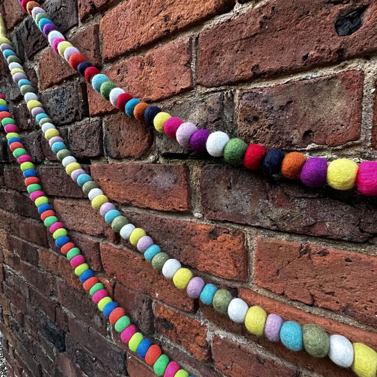 Felt bubble garland by Felt So Good.  Perfect for a Summer garden party, Easter decorations, draped across the mantlepiece during colourful Autumnal months and definitely for Christmas! Made entirely from hand rolled, biodegradable felt balls with a reusable cotton bag, these garlands make for a perfect decoration for any time of year.