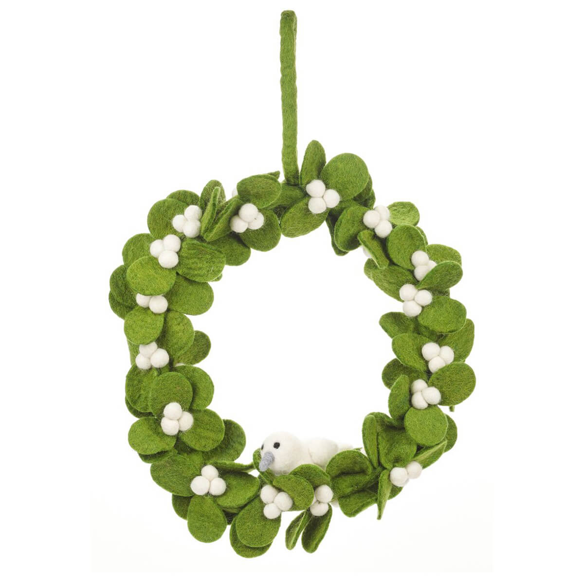 Large Mistletoe wreath with dove Christmas decoration by Felt So Good. A beautiful alternative to a traditional Christmas wreath. This stunning Mistletoe Wreath is made from biodegradable, handmade felt coloured with natural and organic dyes. Wet felted leaves, hand stitched together onto wire. This truly special decoration is one you'll look forward to getting out each Christmas for years to come.