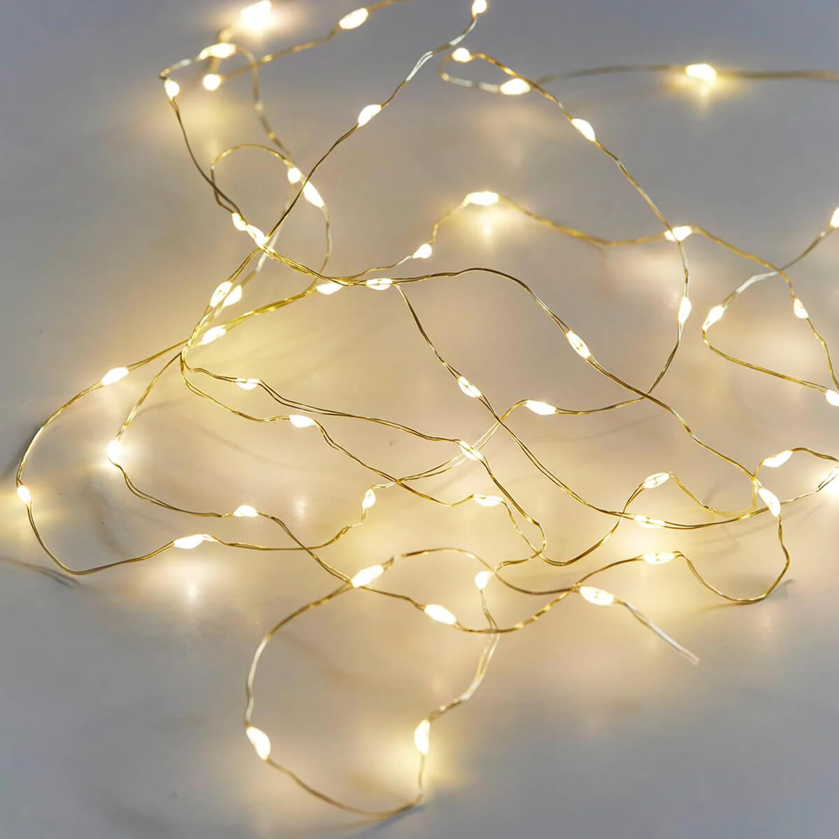 Gold LED string lights by Talking Tables. Classic in colour and design, these gold LED lights will bring a soft ambient light to dark winter evenings. Perfect to brighten up a Christmas table, for gold-themed parties or for a cosy atmosphere in everyday use, these string lights have 60 LED lights included on a three metre string.