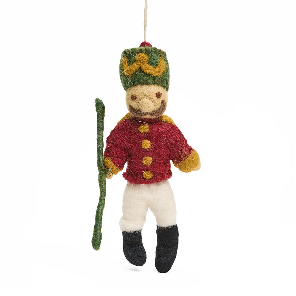 Nutcracker Hanging Christmas Decoration by Gry & Sif. This festive felt nutcracker, dressed in a bright red jacket and green hat, comes with a loop for easy hanging. A classic Christmas character to add charm to your tree, door, or mantel. Handmade and truly unique. Suitable for hanging from the Christmas tree, dangling from foraged branches or displayed in your window for a hygge Danish Christmas.