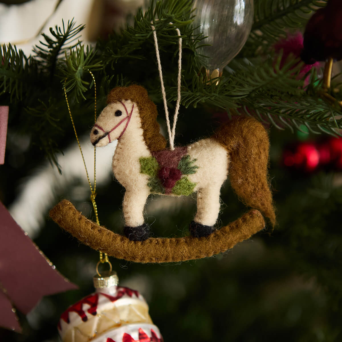Rocking Horse Christmas Decoration by Shirley Bredal. This hand-felted rocking horse ornament exudes nostalgic charm, meticulously crafted from the finest wool to capture the timeless joy of childhood.