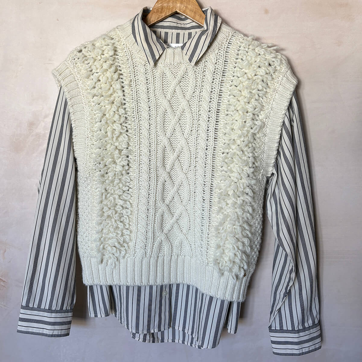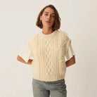 Boby Knit Vest by Des Petits Hauts. Worn layered over a top or a shirt, Boby is a new take on the preppy sleeveless jumper with its cable stitch design and fur-effect knit. A statement piece that stamps its style throughout the winter. Sleeveless jumper made from merino wool and superfine alpaca.