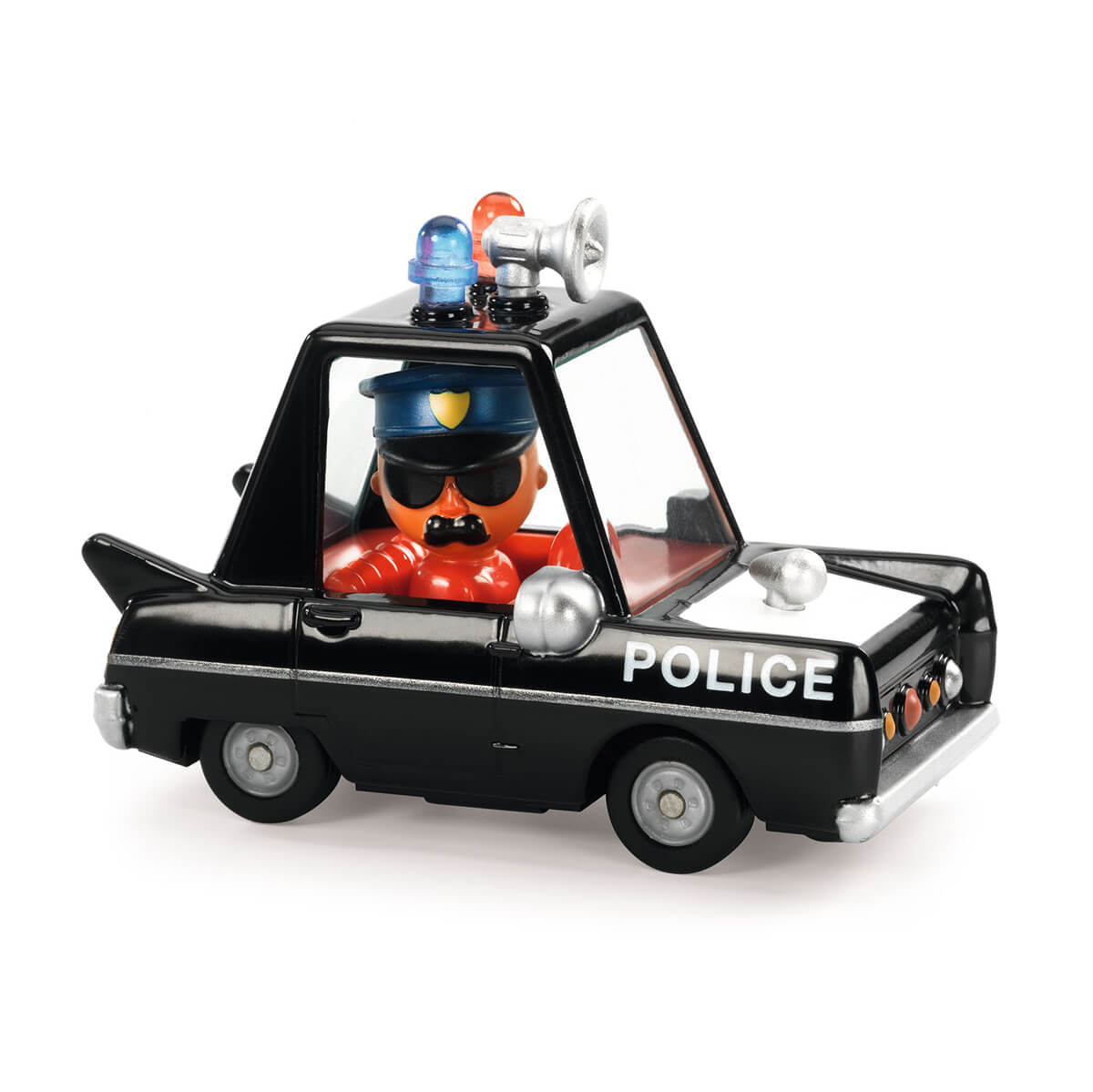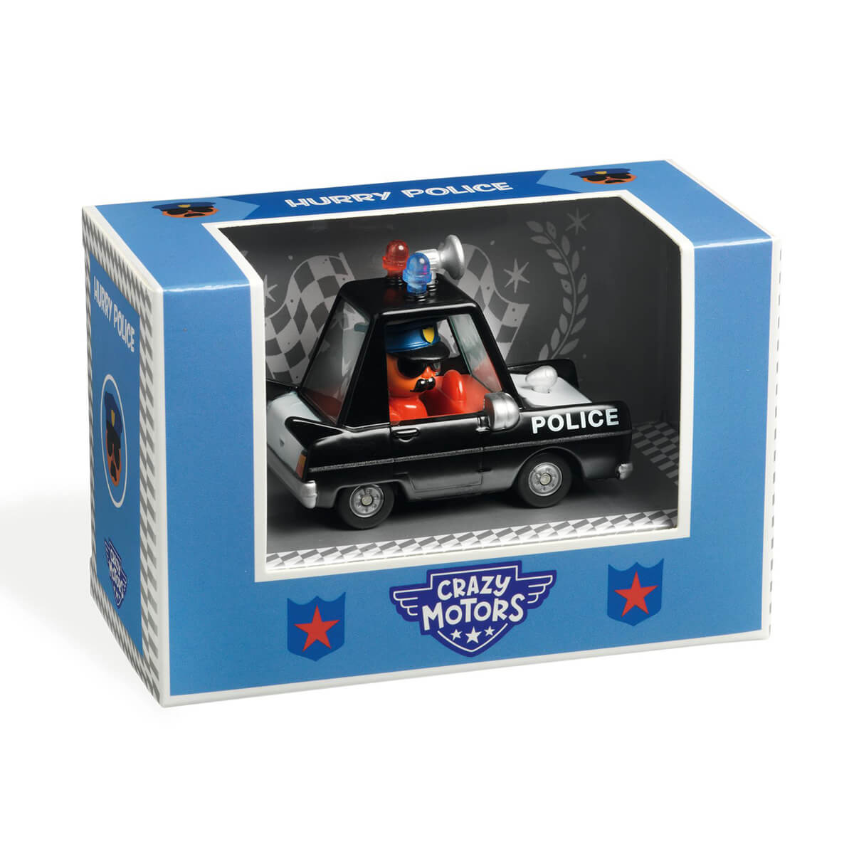 Crazy Motors Hurry Police Car by Djeco. Metal racing car with realistic suspension and character racer. This Crazy Motor is an American style police car. We hear its powerful siren in the distance and we see its flashing lights. Quick, everyone push, Hurry Police are chasing the bad guys!