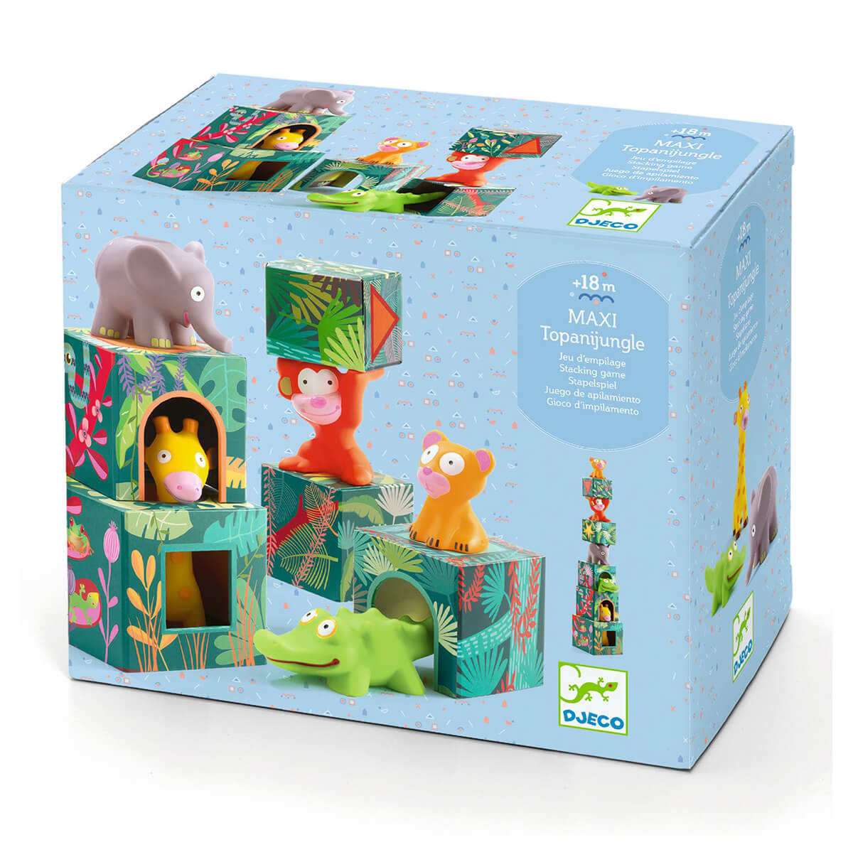 Maxi Topanijungle stacking game by Djeco. Help the animals find their homes or build something new with this sweet stacking toy. Set includes 5 cubes and 5 animals: elephant, giraffe, lion, crocodile and monkey.