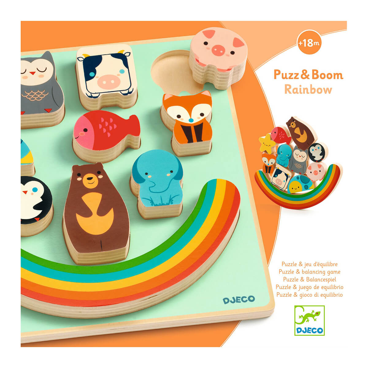 Puzz & Boom Rainbow Wooden Puzzle And Balancing Game by Djeco. Puzz & Boom is an easy-to-assemble wooden puzzle and balancing game. The 3D animals stand up by themselves and can be balanced on top of each other to form a pyramid on the rainbow base.