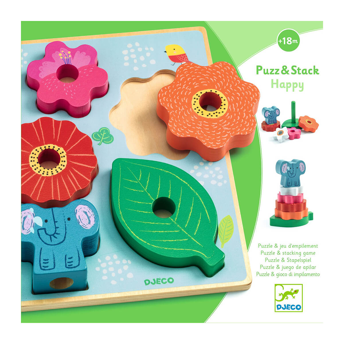 Puzz & Stack Happy Wooden Puzzle And Balancing Game by Djeco. Puzz & Stack is an easy-to-assemble wooden puzzle and stacking game. The flowers stack onto the wooden peg to form a pretty flower pyramid with a little elephant on top.