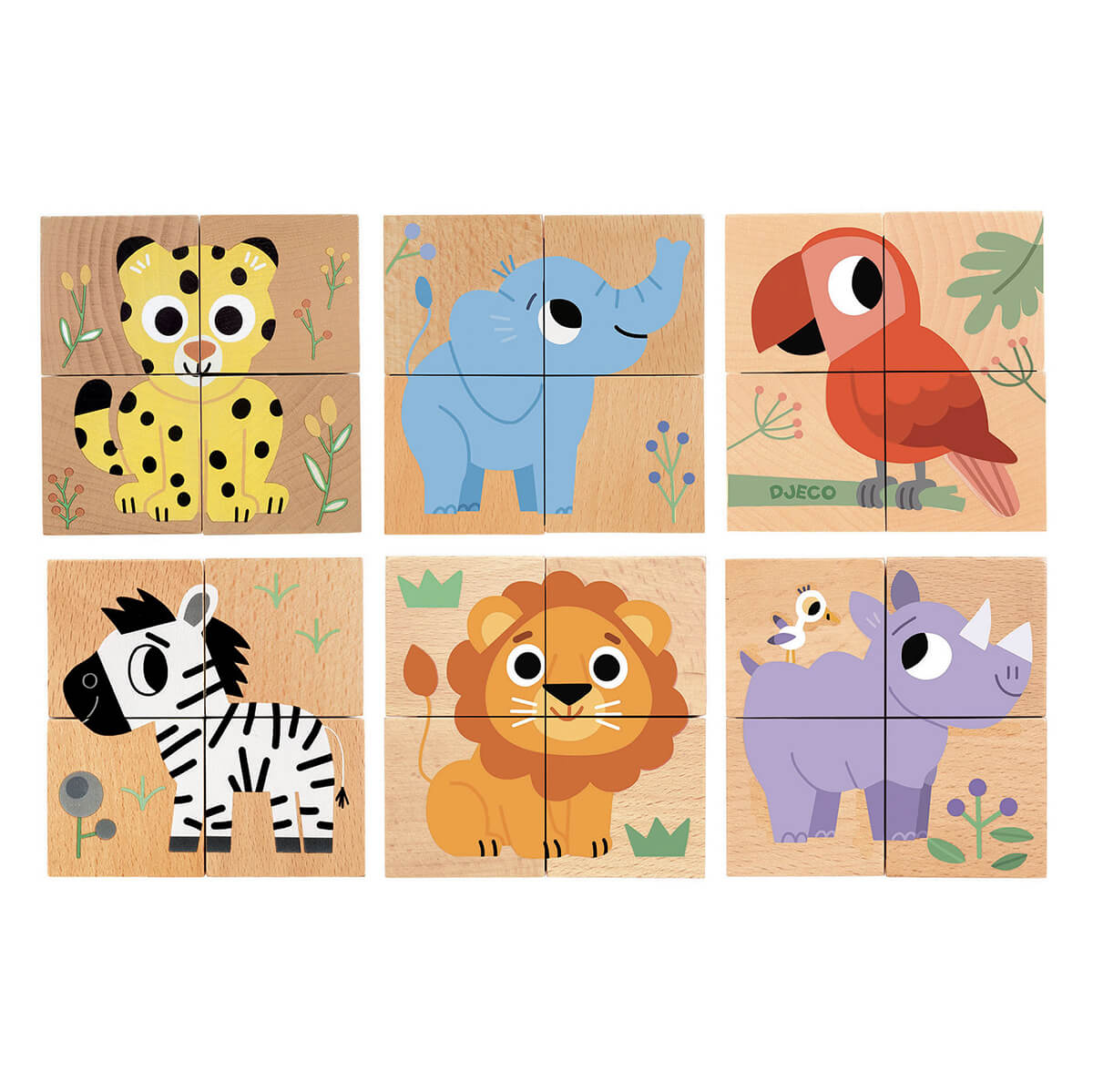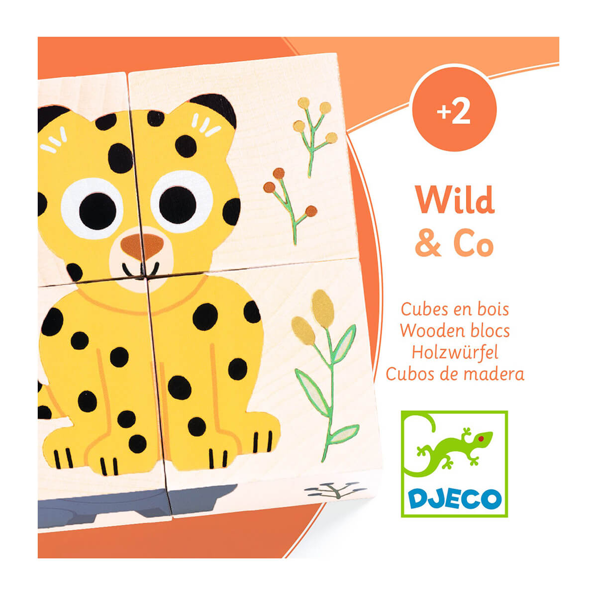 Wild & Co Wooden Block Puzzles by Djeco. 4 wooden blocks children can use to reconstruct 6 puzzles on the theme of wild animals.