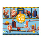 Zig and Go Junior Racer 51 pieces by Djeco. 51 piece chain reaction puzzle and wooden construction set for younger children age 5+. This 51 piece accessory set with wooden dominoes, ball and components will inspire creativity and build skills like perseverance. In this set the dominoes are easier to set up and have a little track. The child follows the three models in the booklet to build their journey or imagine others endlessly. This game for ages 5 and up is compatible with all the boxes in the collection to invent even more ingenious action-reaction courses.