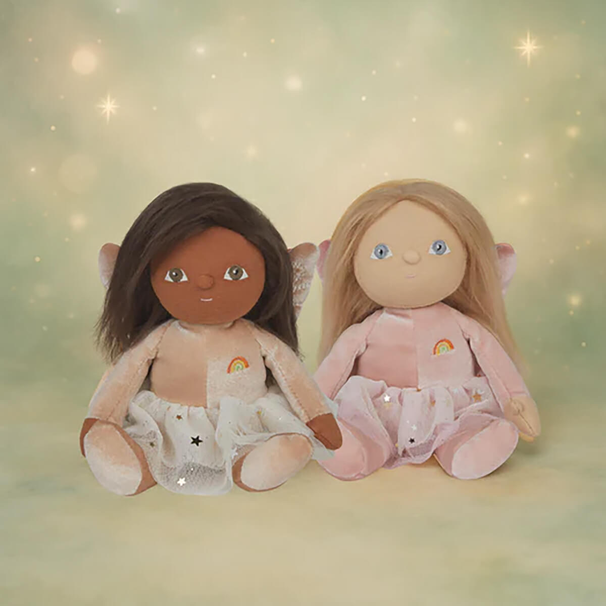 Fiona Fairy Dinky Dinkum Doll by Olli Ella. Fiona giggles a lot. She comes from the Rainbow Realm, where even the raindrops laugh. Pop her in a pocket and she’ll come with you everywhere - probably still giggling. Dressed in a sparkly pink onesie and a starry tulle skirt, Fairy Fiona is made for fluttering fun and snuggly moments. Her soft, posable body is just the right size for little hands and magical adventures on the go. With twinkly wings and a sweet rainbow stitched over her heart, she’s full of charm and cheer.