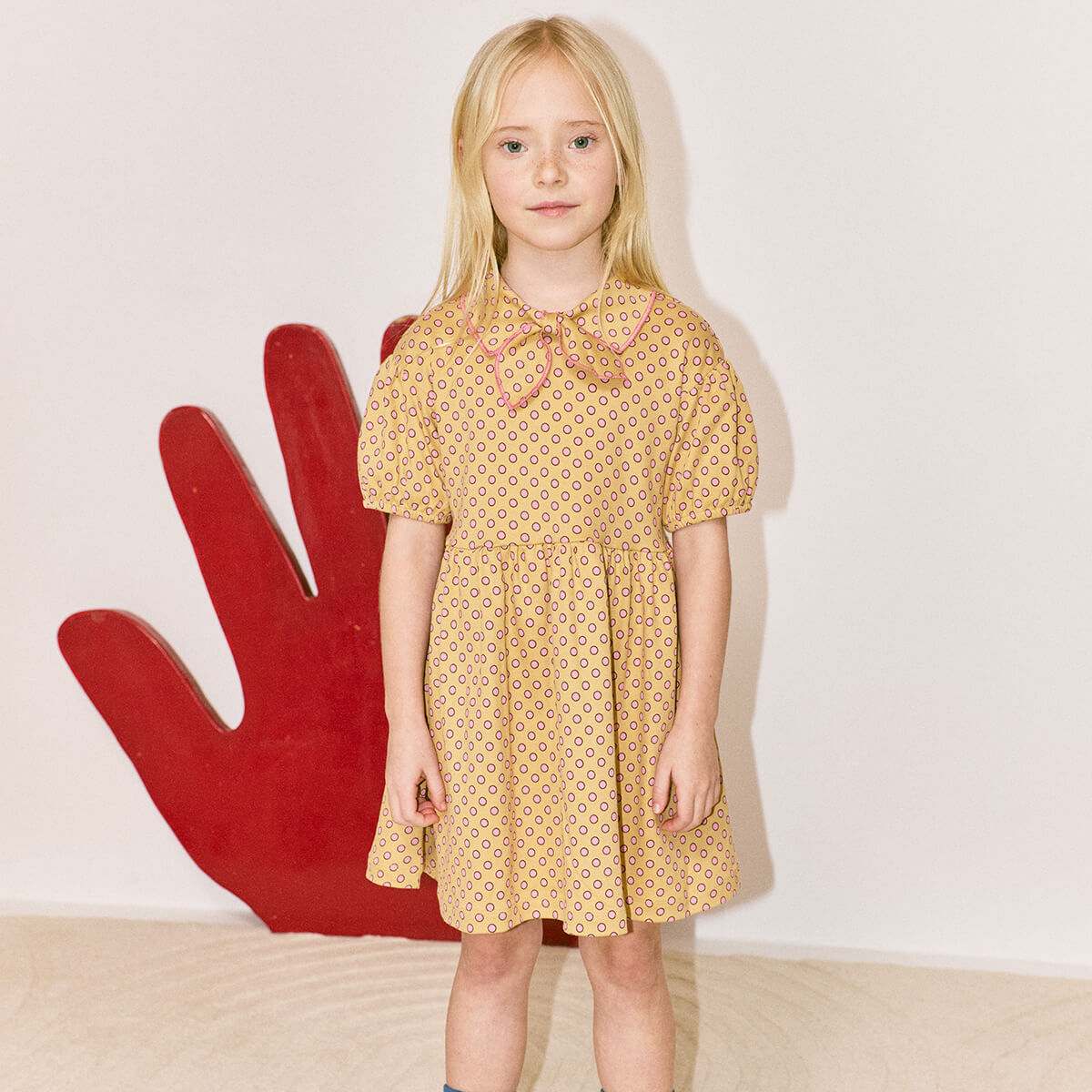 Junior Scout Dress by Misha & Puff. Inspired by Misha & Puff’s signature Scout Top, a short-sleeved peplum-style dress in organic cotton. Featuring puff sleeves with soft elasticated cuffs, and the Scout pull-through kerchief paired with a soft pointed collar. This cotton is slightly thicker than our Pima styles, with a touch of structure that holds shape.