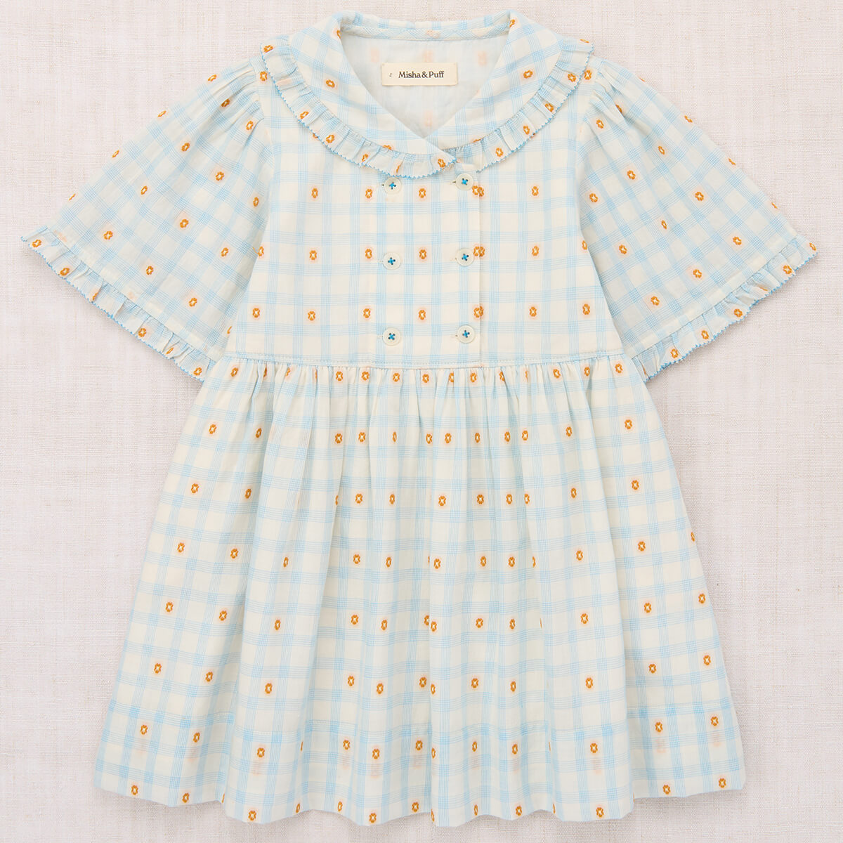 Voyage Dress by Misha & Puff. A dress in lightweight organic cotton plaid, with a woven textured design, rounded collar, elbow-length sleeves, gathered waist, ruffle trim with edge detail, and a double-breasted corozo button closure. Lined in cotton voile and finished with French seams.