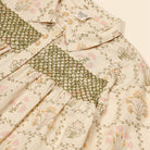 Aline Smock Shirtdress by Apolina. The beautiful vintage-inspired Aline shirtdress is crafted in cabin quilt floral print in cream. Featuring hand smocking in ‘sage green’ at chest, cuffs and pockets. Button through shirt style. Aline evokes classic story book style, we love her worn as a dress with tights, or worn unbuttoned over dungarees or jersey layers.