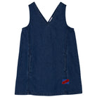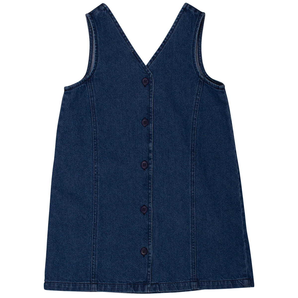 Denim pinafore by Wynken. An above the knee denim dress with v neck and front pockets. With buttons closure on the back.