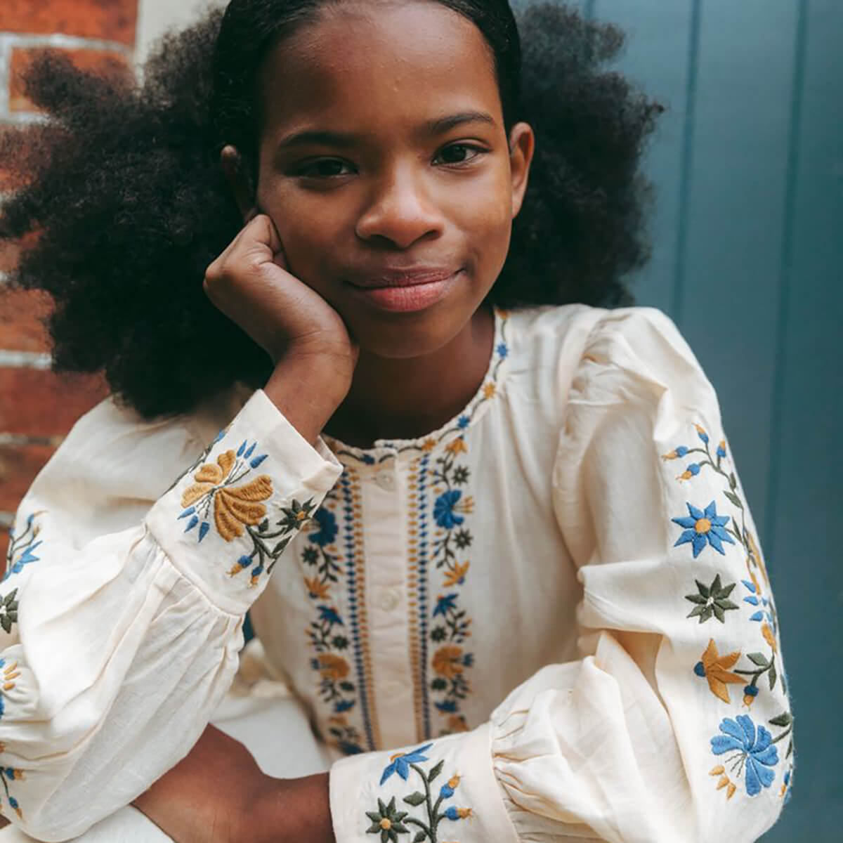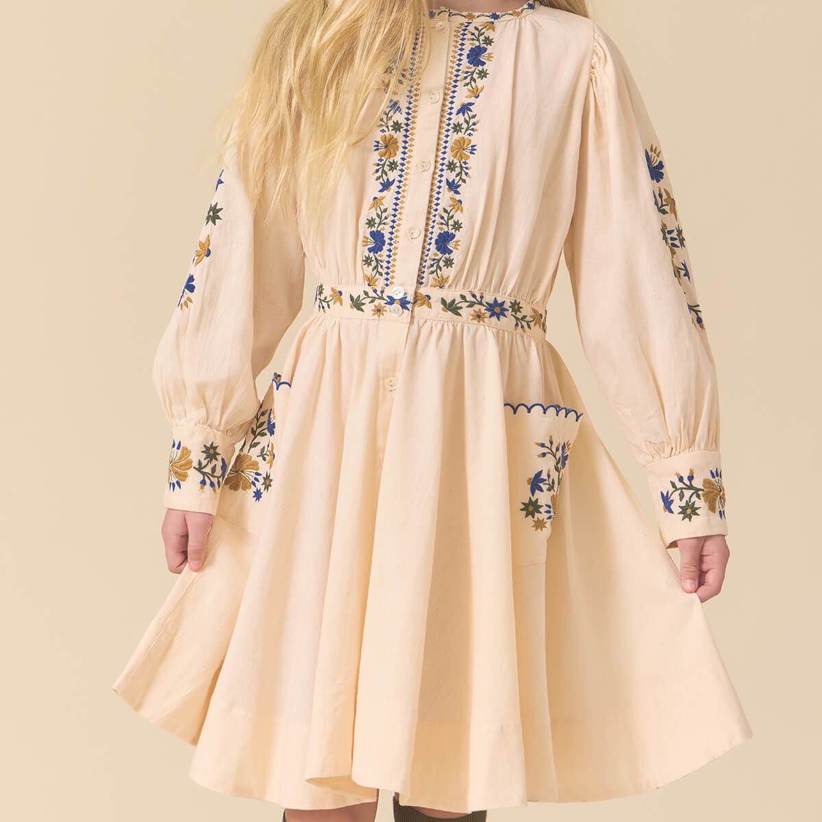 Blair Dress by Lali. Delicate embroidery traces the bodice and cuffs, adding quiet charm to its vintage-inspired silhouette. Soft gathers at the neckline and a full circle skirt create an easy, twirl-worthy shape, while a row of delicate buttons runs from collar to hem. Thoughtful and timeless, it’s a piece made for cozy celebrations and snow-dusted mornings.