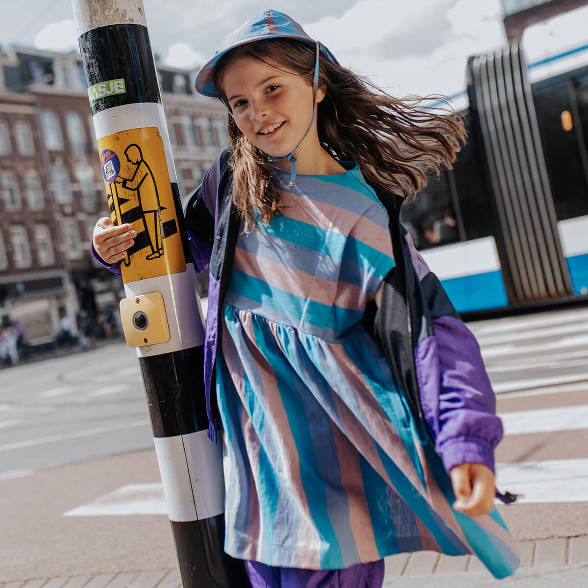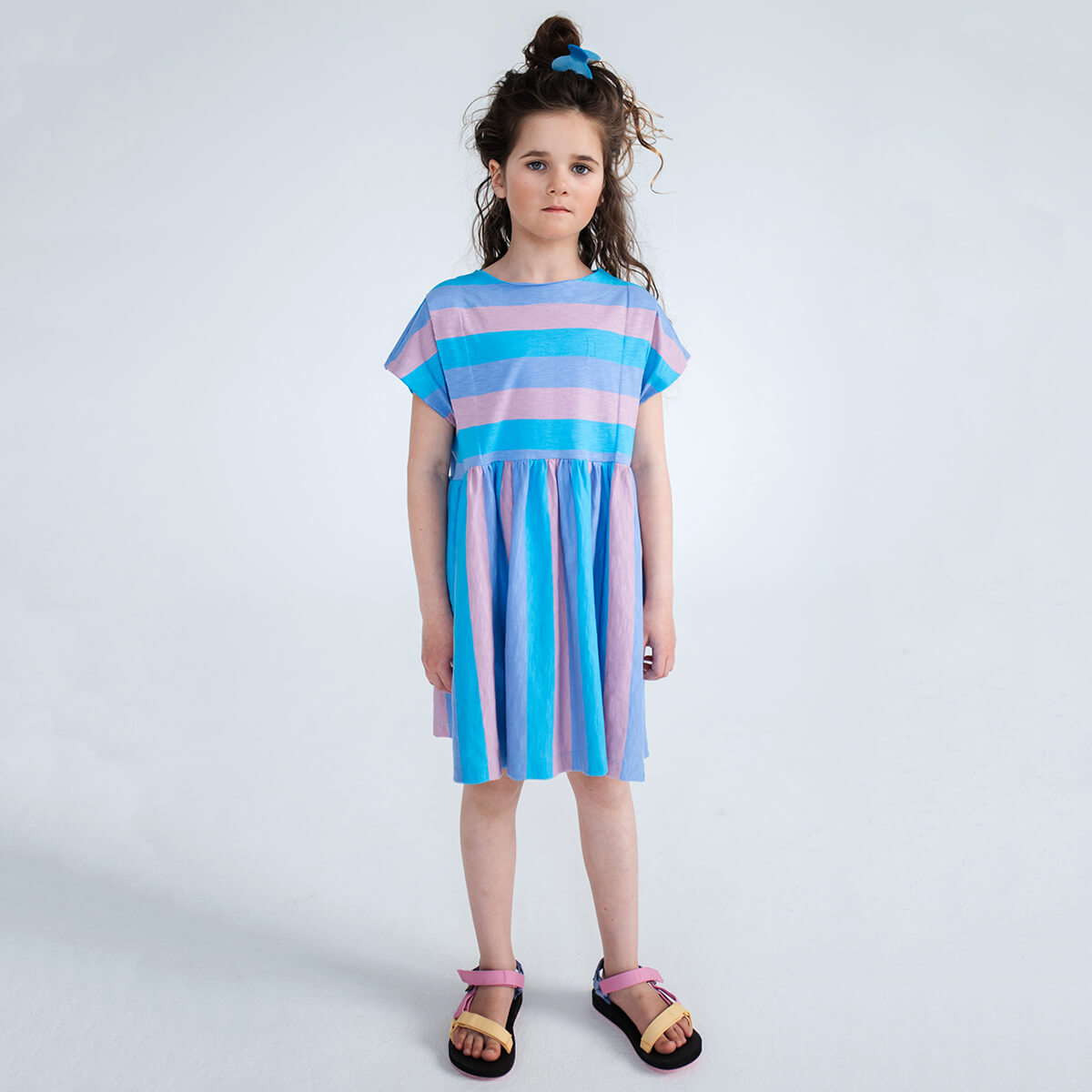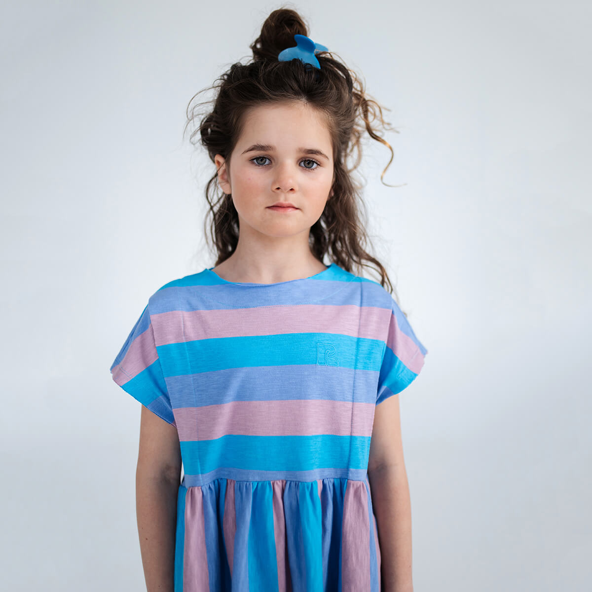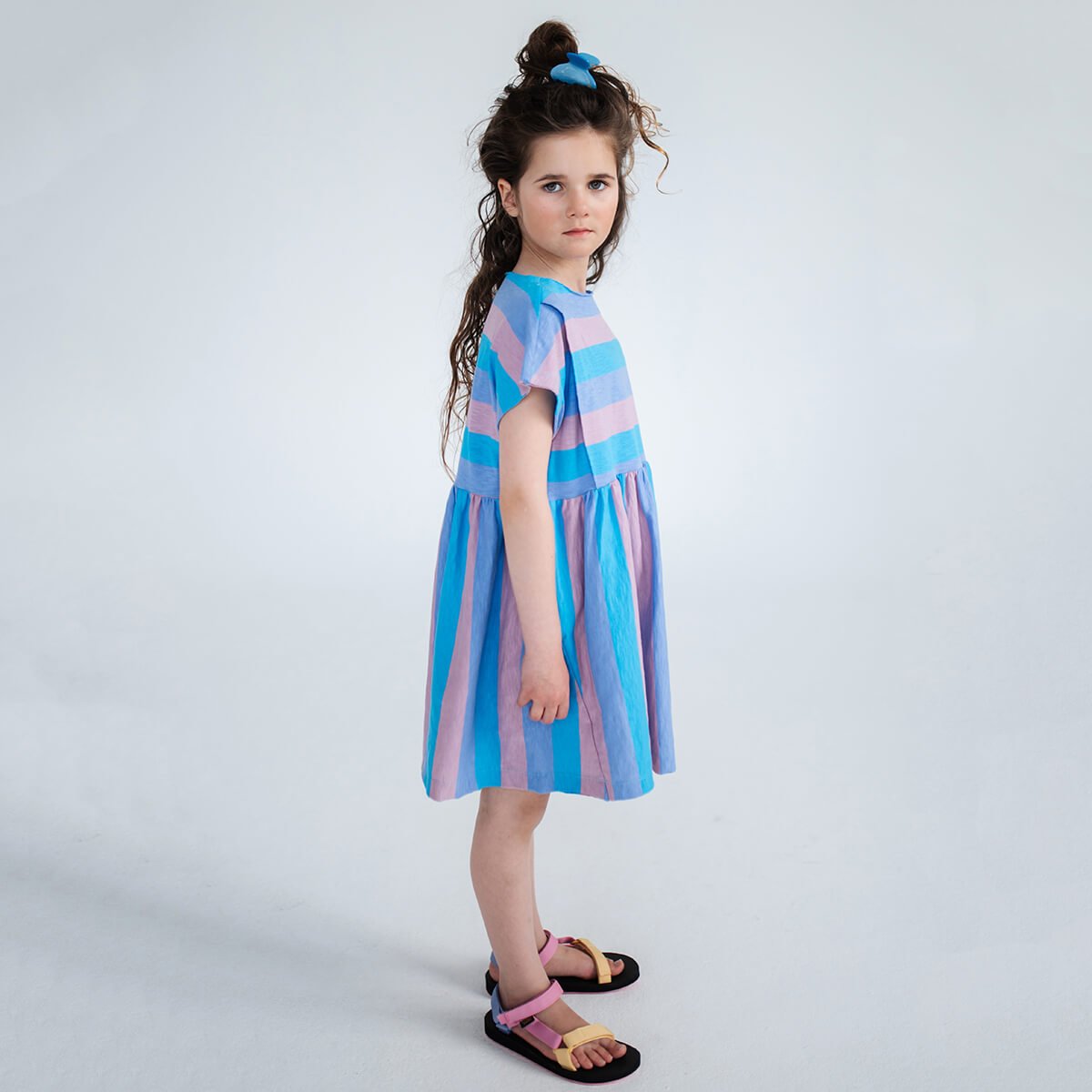 Every Day Dress by Repose AMS. The every day dress in tricolour block stripe is crafted from soft, yarn dyed organic cotton. It is designed with pleated details on the front panel and features a flowy, A-line skirt with a knee-length cut, side pockets, short sleeves and a raw edge along the neckline. A soft and comfortable dress, great for everyday wear.