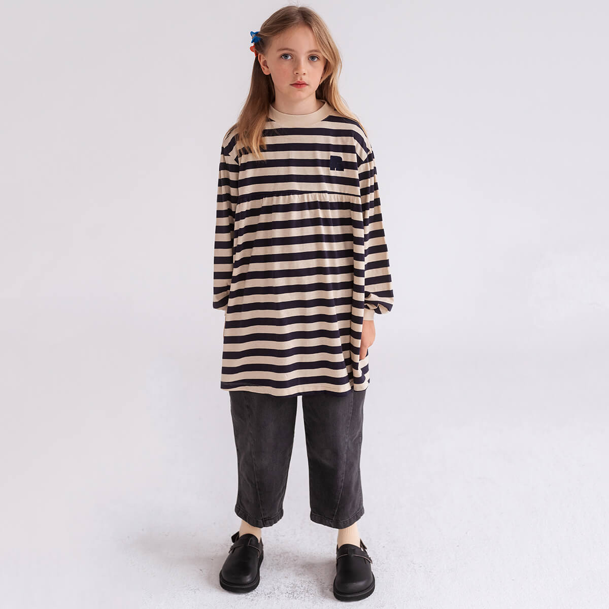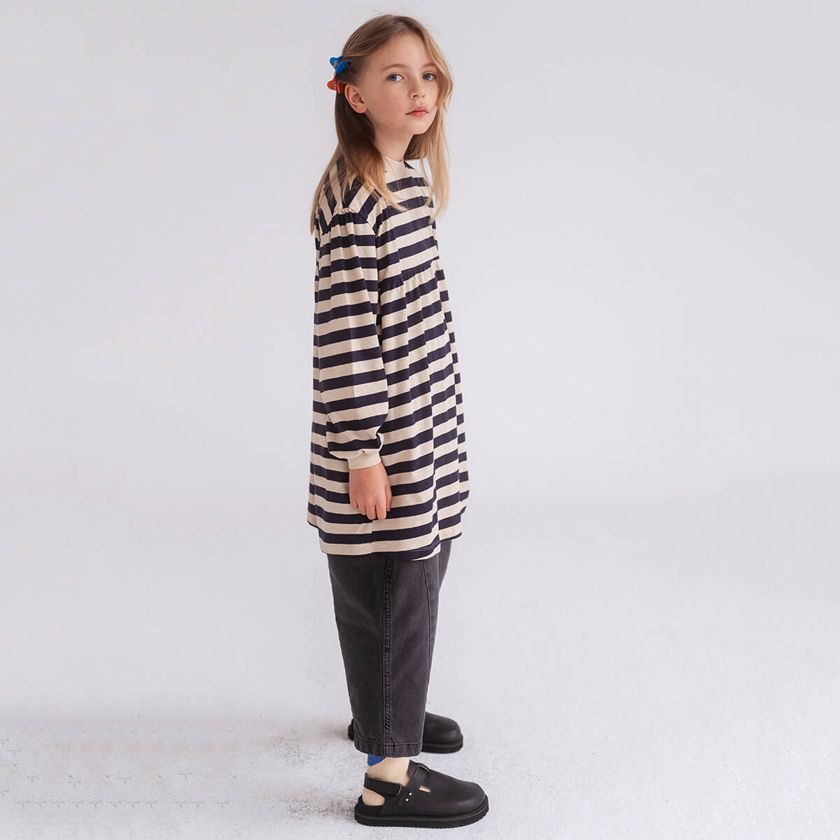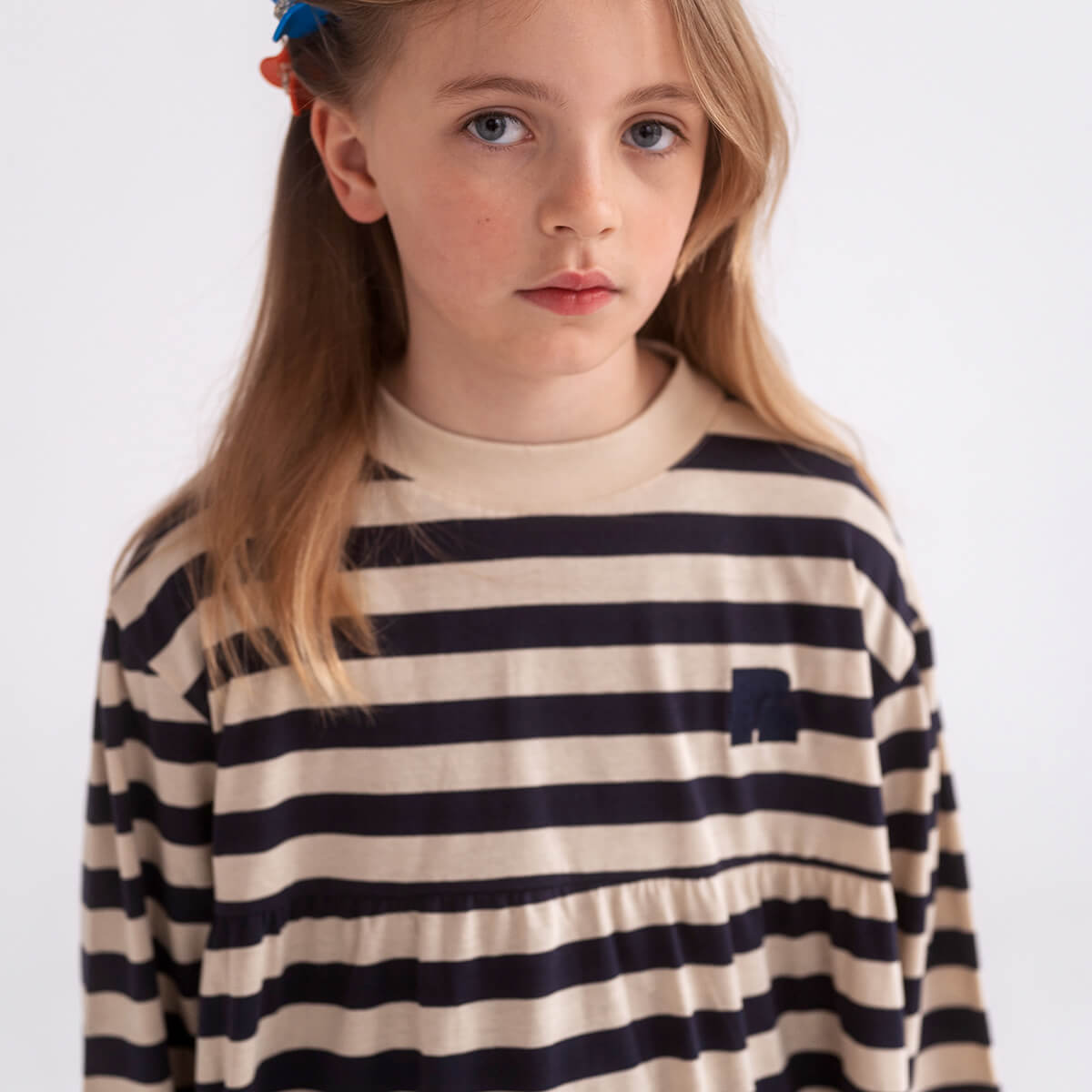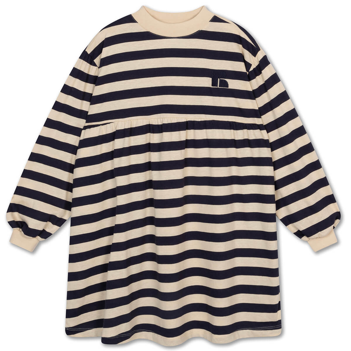 Dress by Respose AMS. The fanned out dress in dark blue fine stripe is crafted from the softest yarn dyed organic cotton. It is designed with a high pleated waist, long sleeves, an embroidered logo at the chest and ribbed neck and cuffs. A soft and comfortable dress, great for everyday wear.